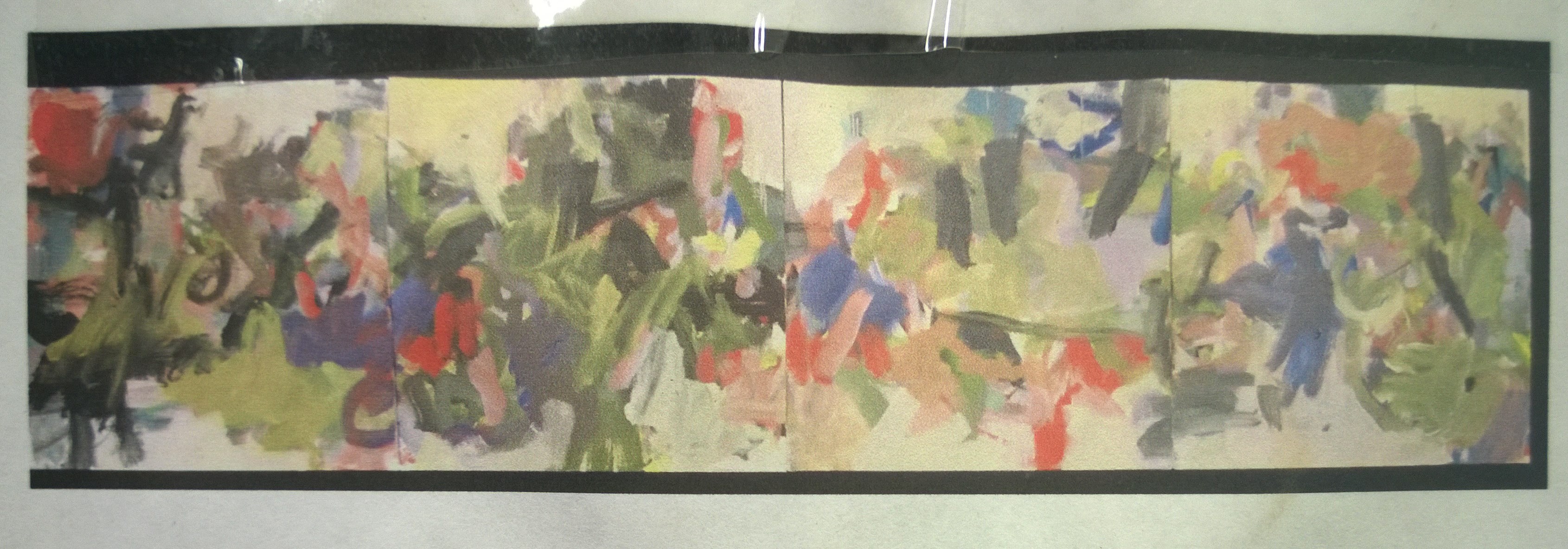 4 pieces. Colors are greens, blues, reds, tans, black. Red area in BR. Greenish area in TL / TC. Some white space throughout. Verso. TL canvas edge: C. C vertical stretcher bar: 30D/92 FLUSHED FIELD. CL canvas edge, with arrows on either side: Outside. CR canvas edge, with arrows on either side: INSIDE. TC and CR stretcher bars, stamped: 30. Stretcher has screws and can be keyed.