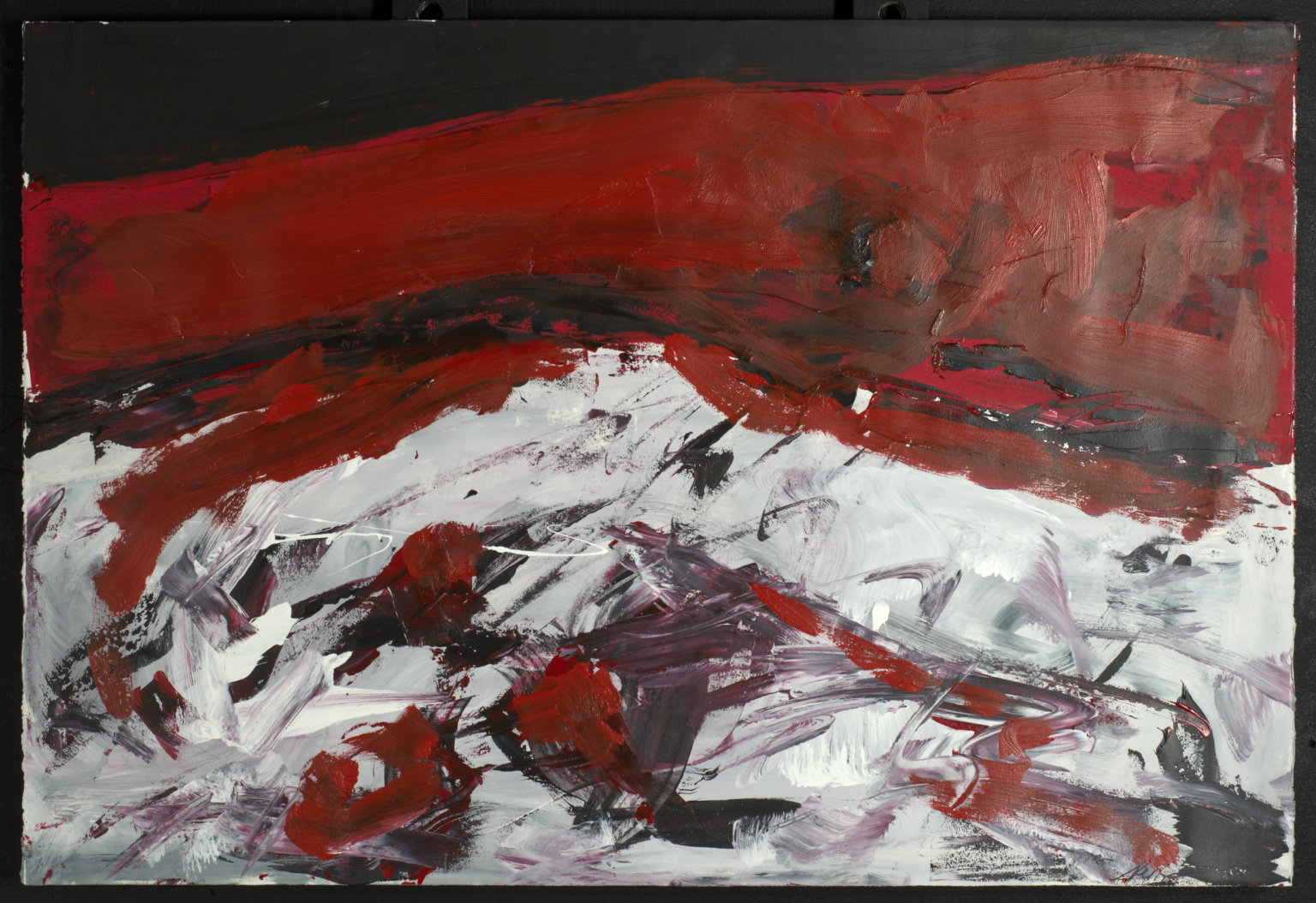 Narrow strip across T is black. Below is wide swath of red with some black. Below is primarily white / gray with red and black. Black area in BR. Verso. TC: What Muse I Do / To Go Free. All 4 corners: 12/02. Watermark BR, backwards: BFK RIVES / FRANCE <symbol>.