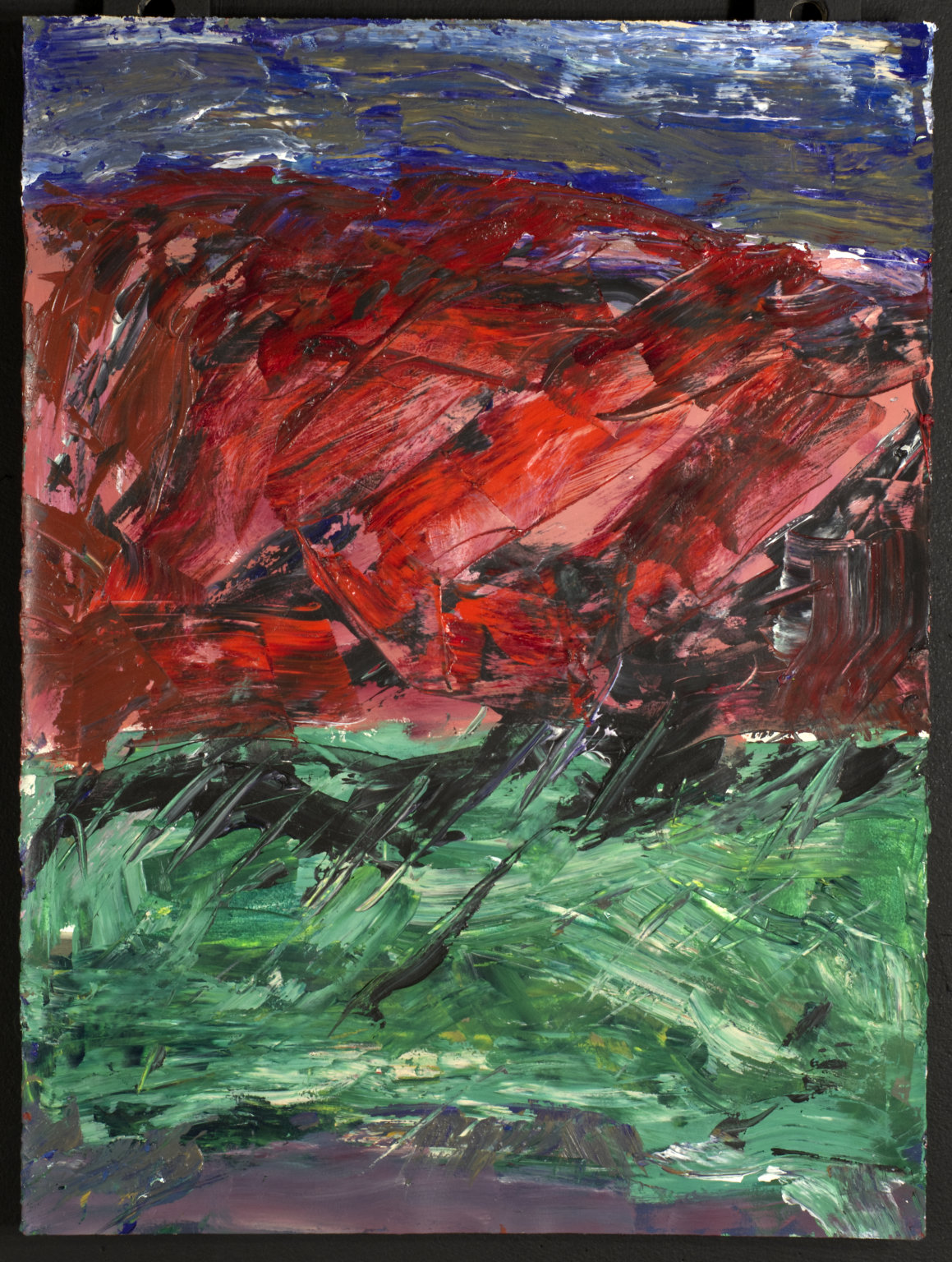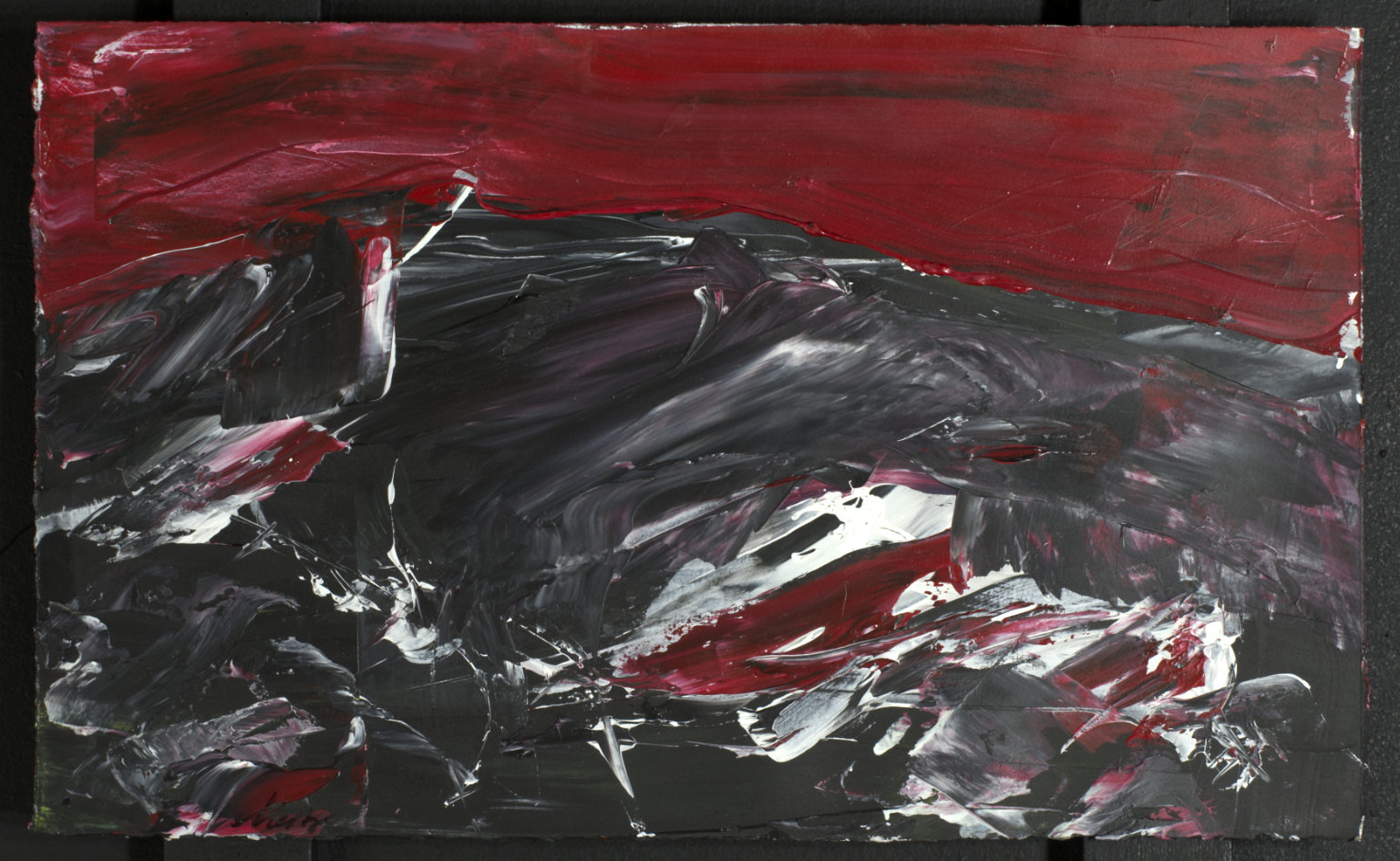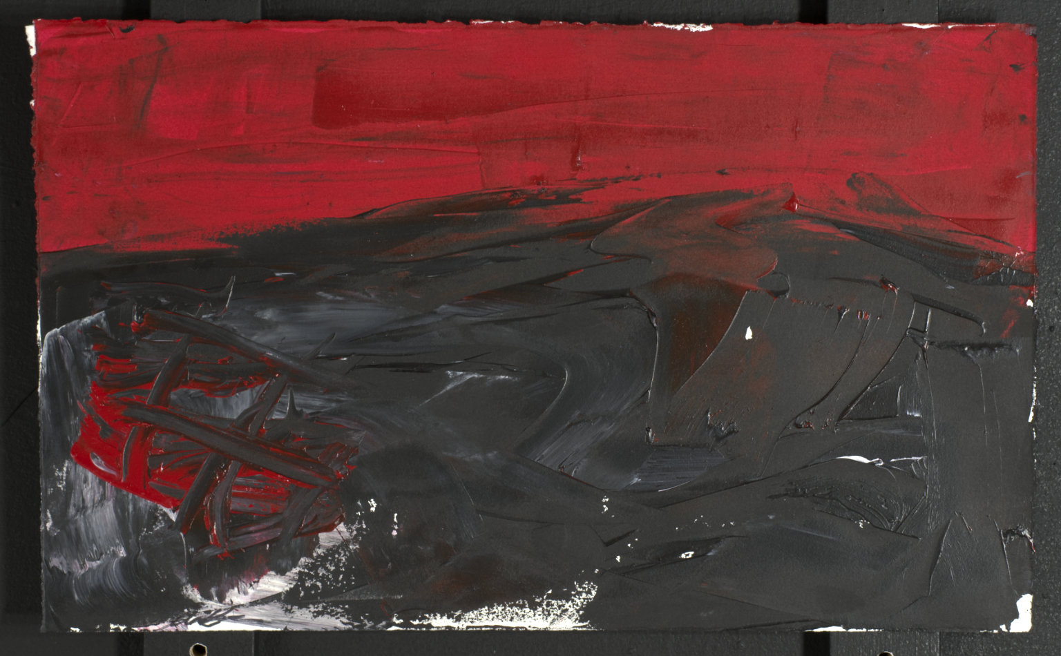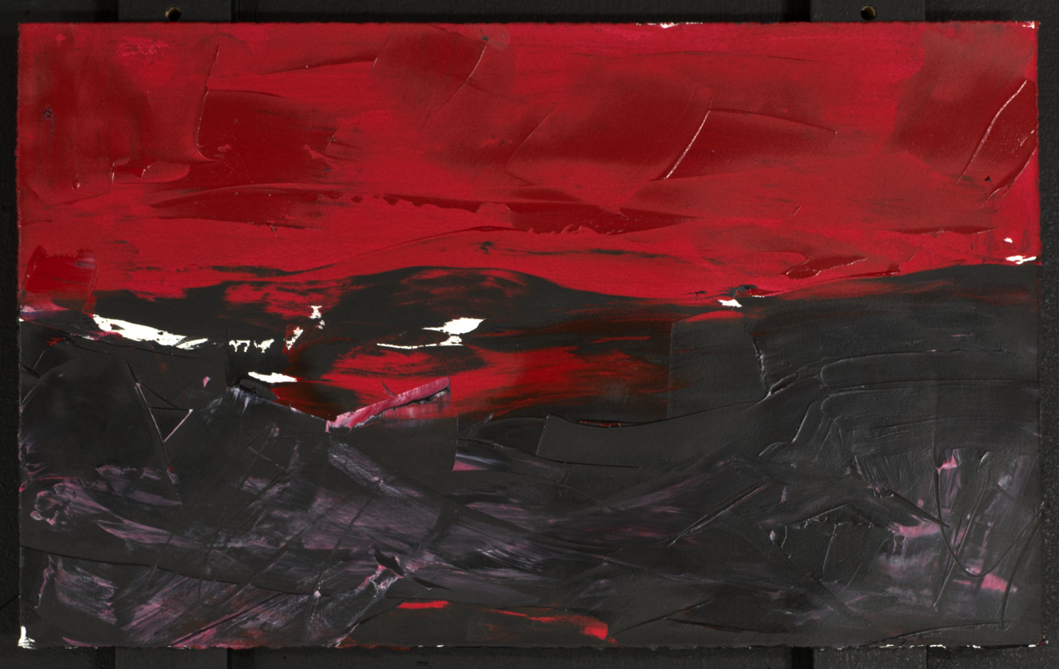 Top third is red. Rest of painting is black, red, green, white. White in C, and a few small areas across B edge. Verso. TC: Not Everyone / Prays for Fire. All 4 corners: 23/02.