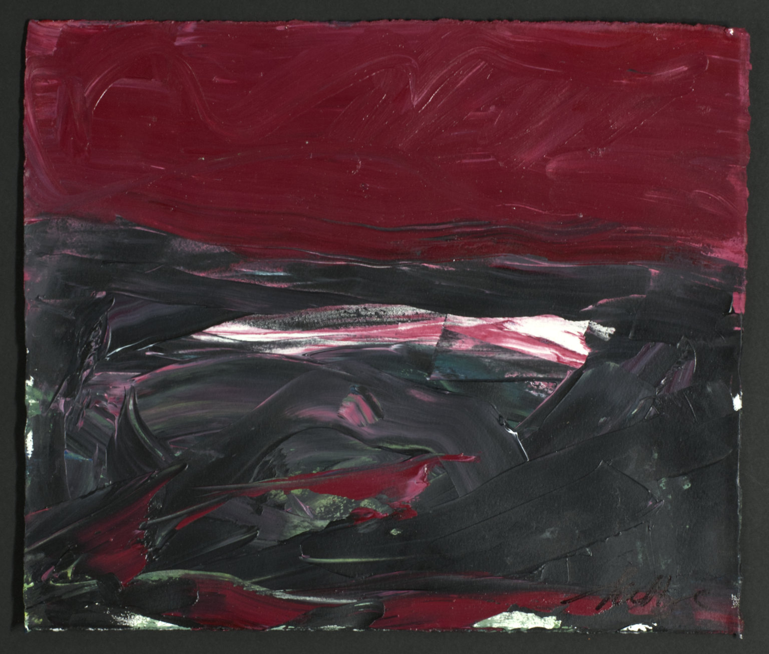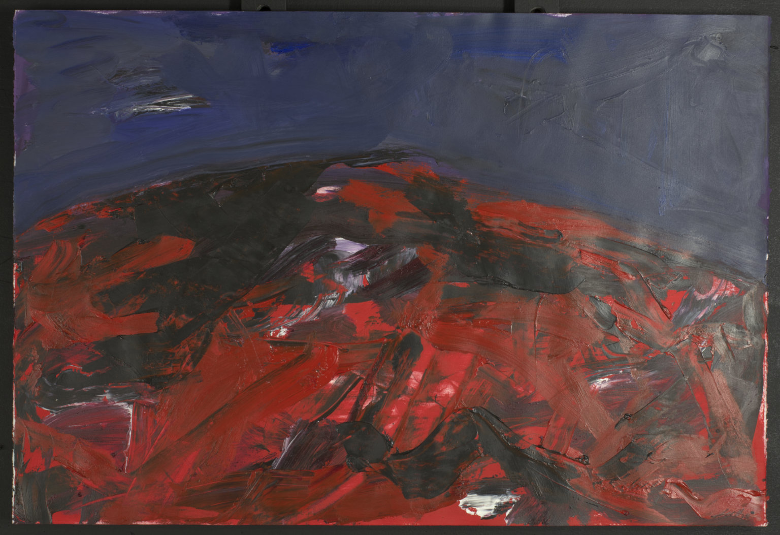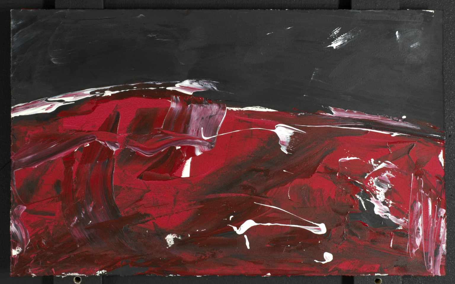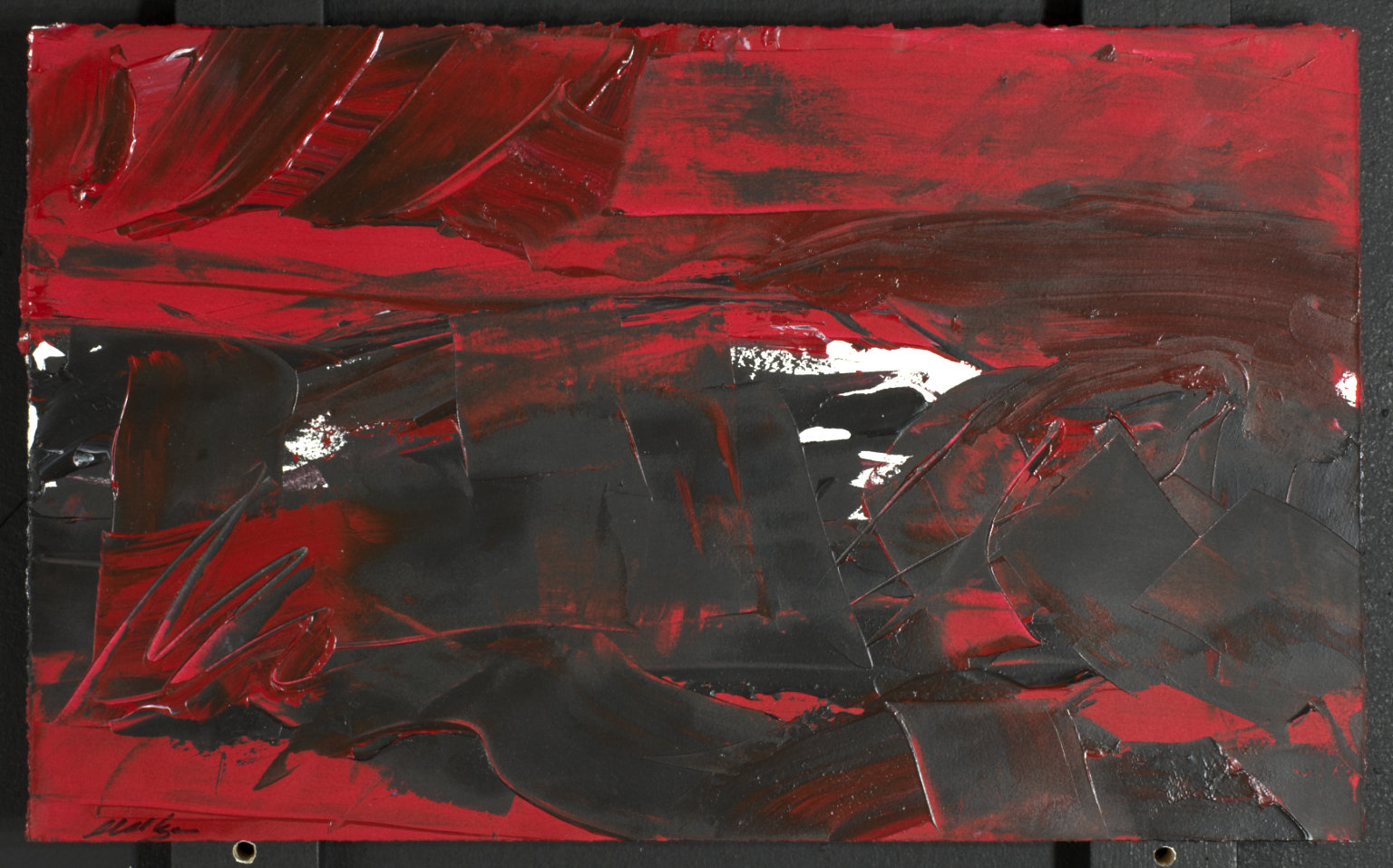 Top third is red. Rest of painting is black, red, green, white. White in C, and a few small areas across B edge. Verso. TC: Not Everyone / Prays for Fire. All 4 corners: 23/02.