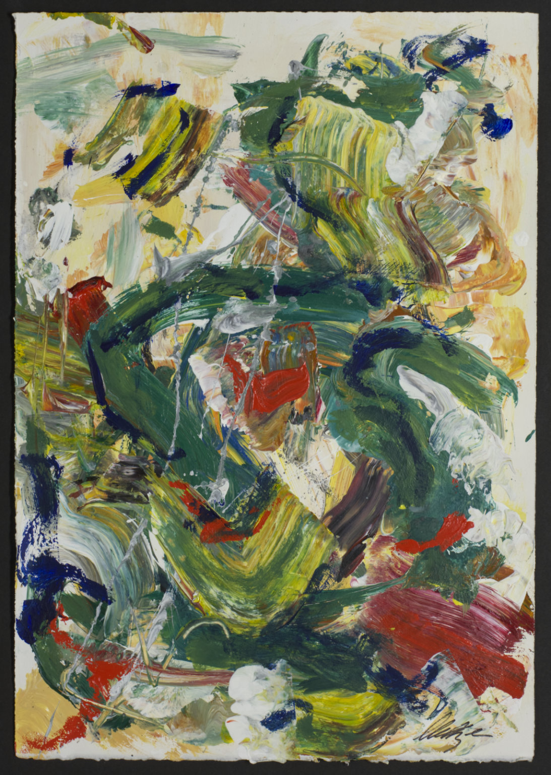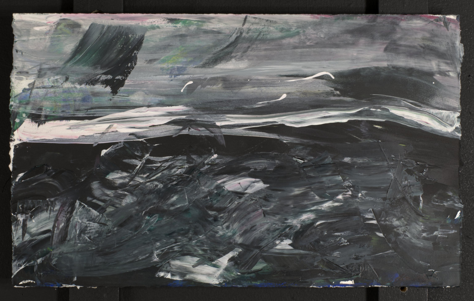 Deckle edge paper. Black with a little greenish-yellow across T 1/3. B 2/3 is primarily teal, with white, black, green, and blue. A little greenish-yellow in CL / BL. Verso. BL and BR: 14/02.