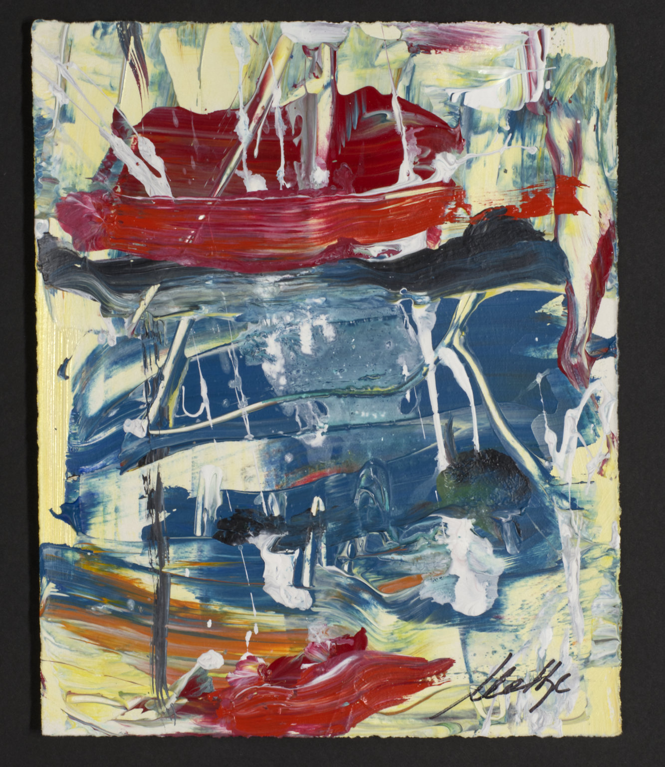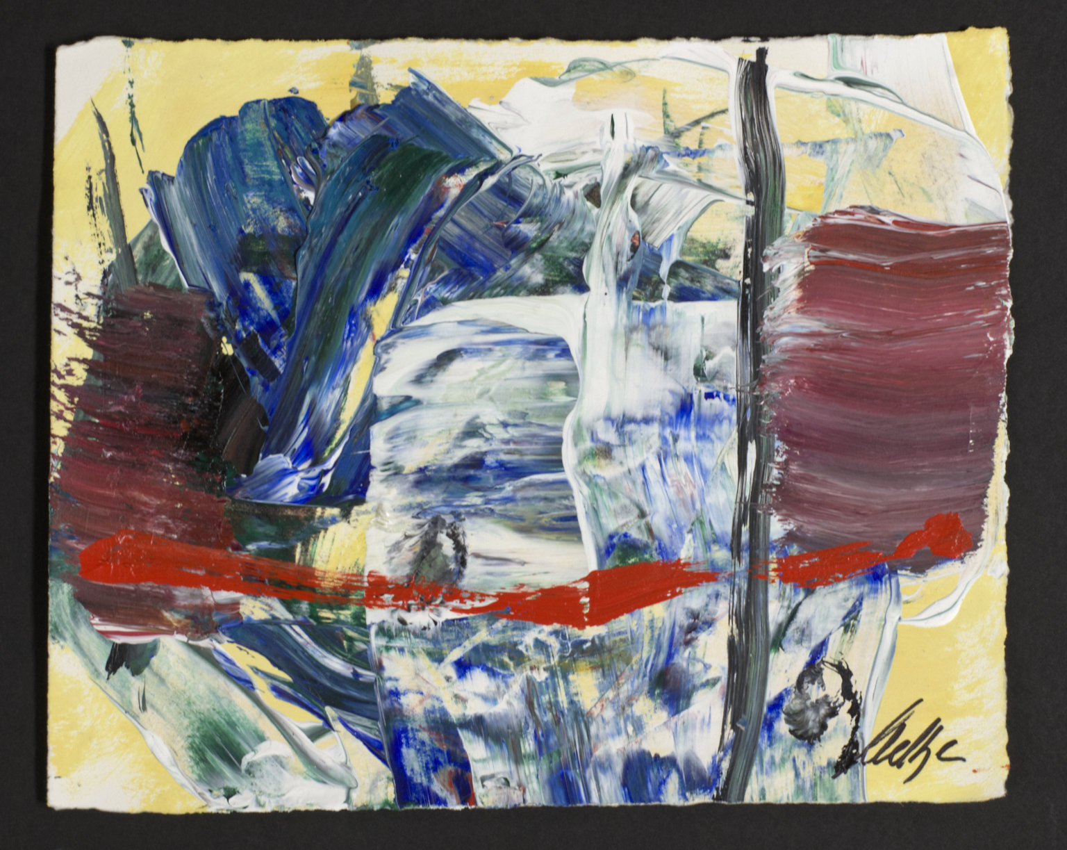 Top third is blues and purples. Bottom 2/3 is primarily reds. White diagonal spatter from C to BR. A little tan in TR. Verso. TC: When The Knife / Skipped. All 4 corners: 10/02. Watermark BR, backwards: BFK RIVES / FRANCE <symbol>.