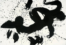 Deckle edge paper. Heavy black line starts in CL, moves through C, and splits in 2 in TR. Dot spatters throughout. Verso. All 4 corners: 1/2003 <incorrect year>. TL: Flown Away. Watermark TL and BR: BFK RIVES / FRANCE <symbol>.