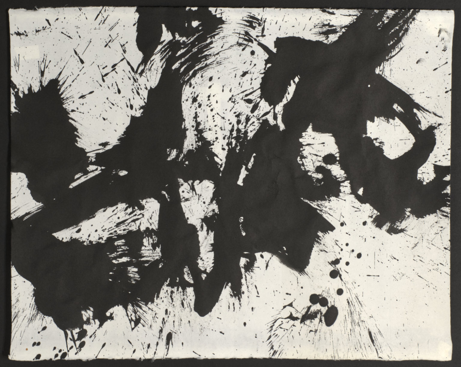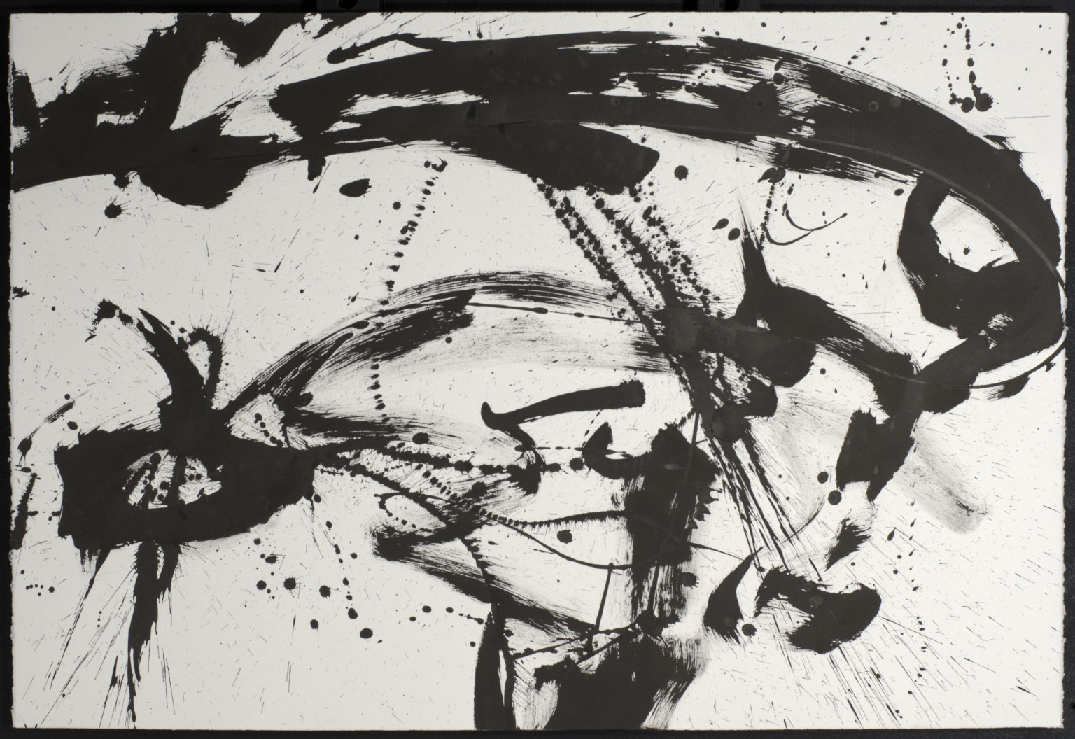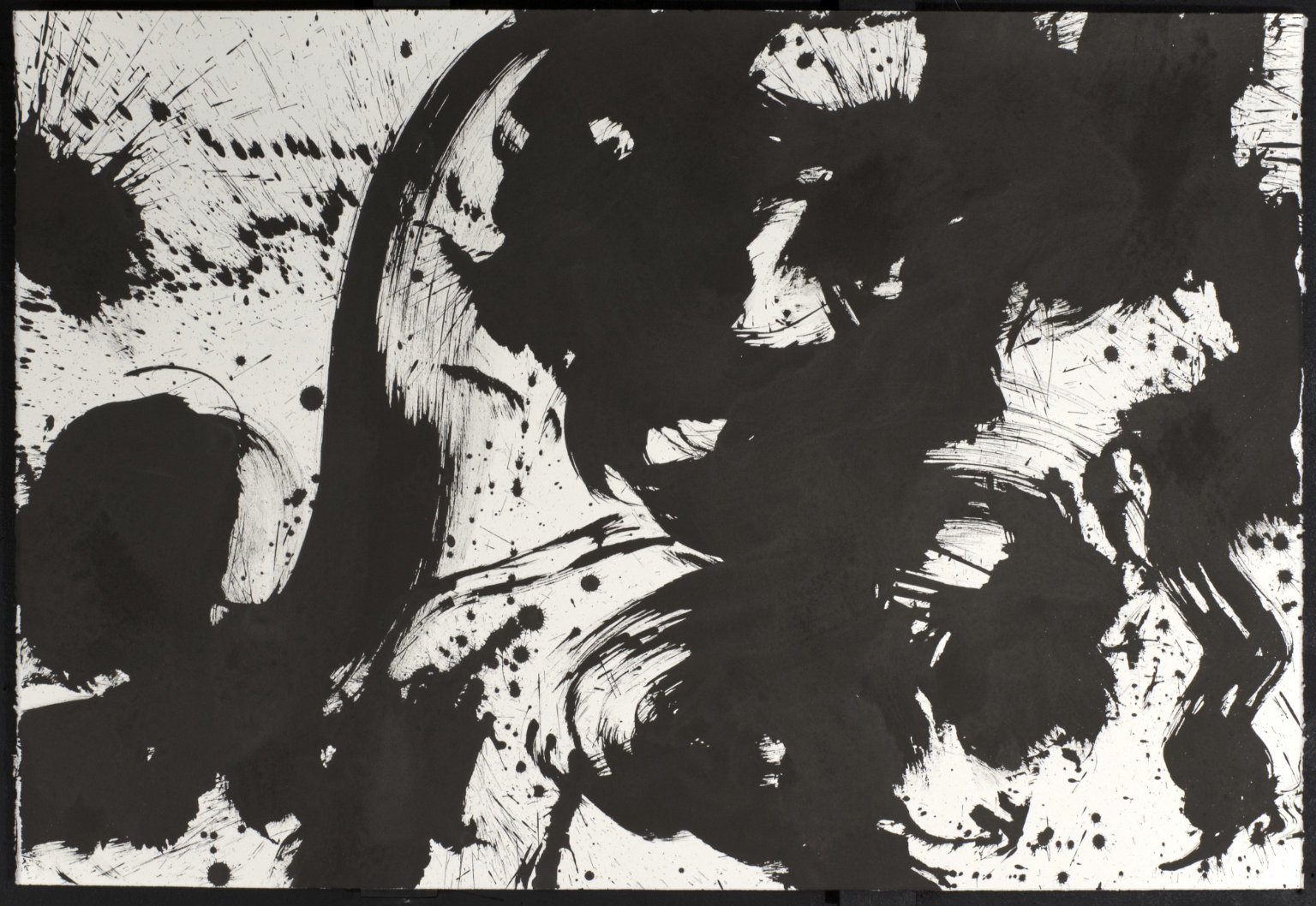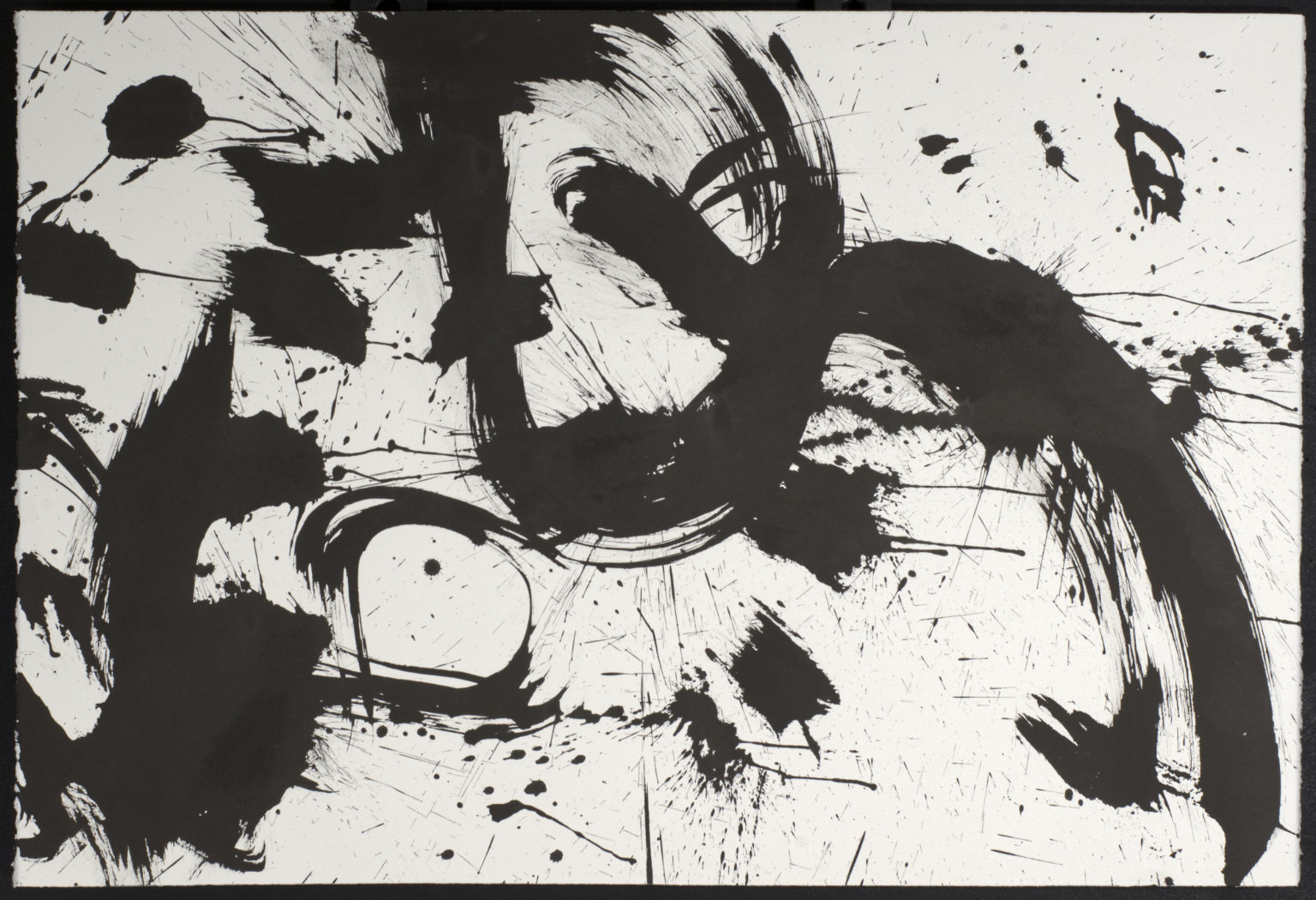 Deckle edge paper. Black curving areas, one on L, one on R. Spatters throughout. Area of vertical dot spatters in TL. Verso. All 4 corners: 13/2003 <incorrect year>. TC: Accustomed / To Your / Face. Watermark TL and BR: BFK RIVES / FRANCE <symbol>.
