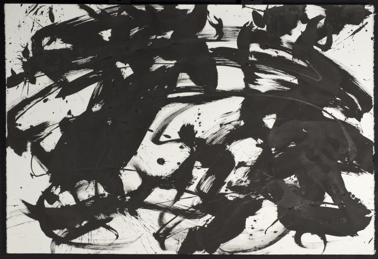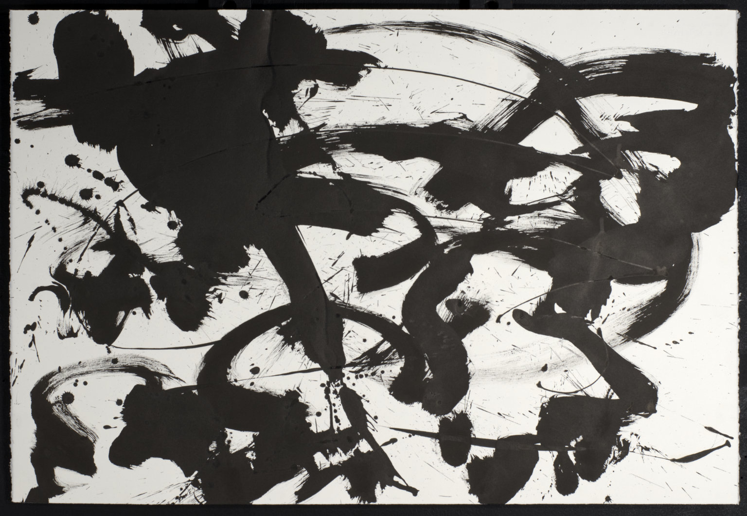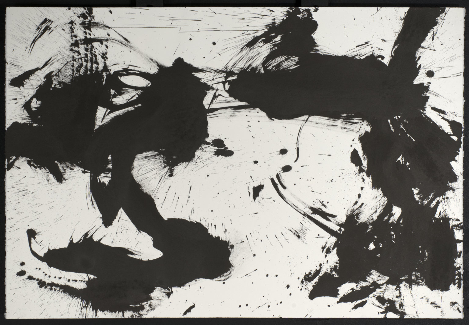 Deckle edge paper. Heavy black lines throughout. Streaky black lines, horizontal, in TC. Small spatters in C. Verso. All 4 corners: 8/2003 <incorrect year>. TC: Nothing Tentative. Watermark TL and BR: BFK RIVES / FRANCE <symbol>.