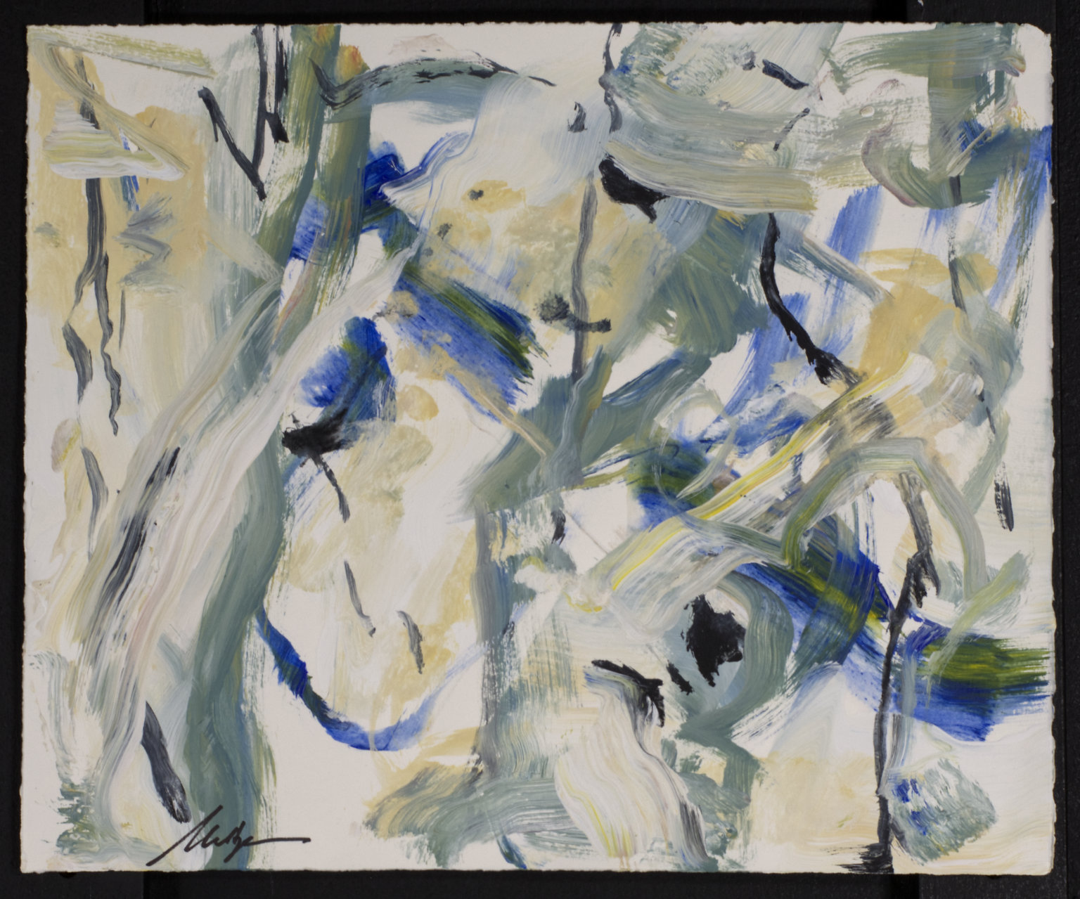 Deckle edge paper. White space throughout. Blue and green diagonal from TL to BR. Tan and black paint are also used. Verso. TC: Murmurs. All 4 corners: 3/2005.