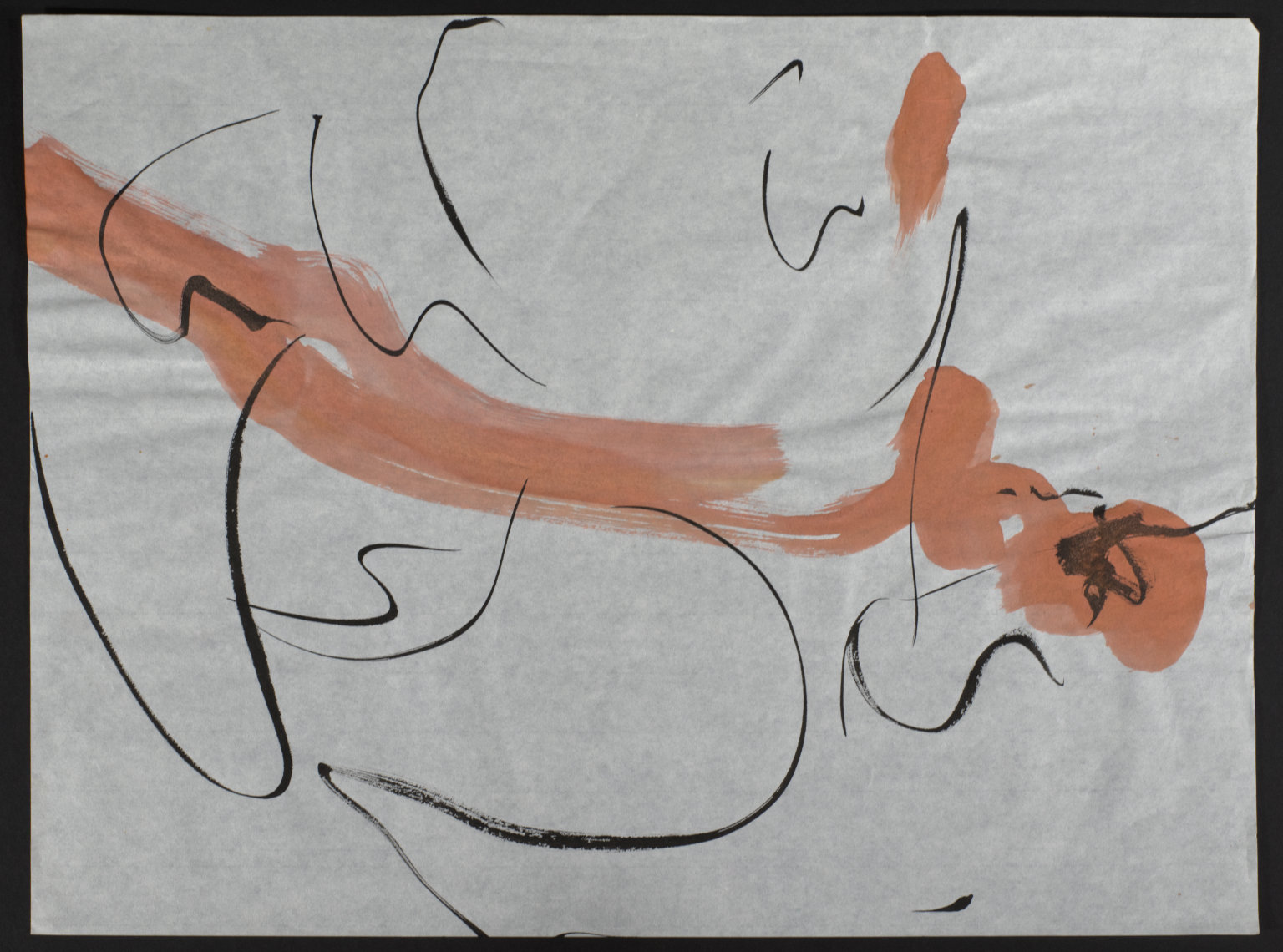 Wide peach line from TL, down across C, ending in CR / BR. Thin black curving lines throughout. Verso. Nothing.