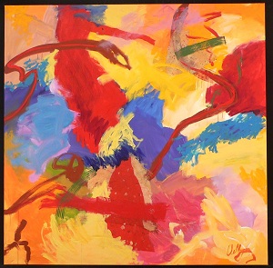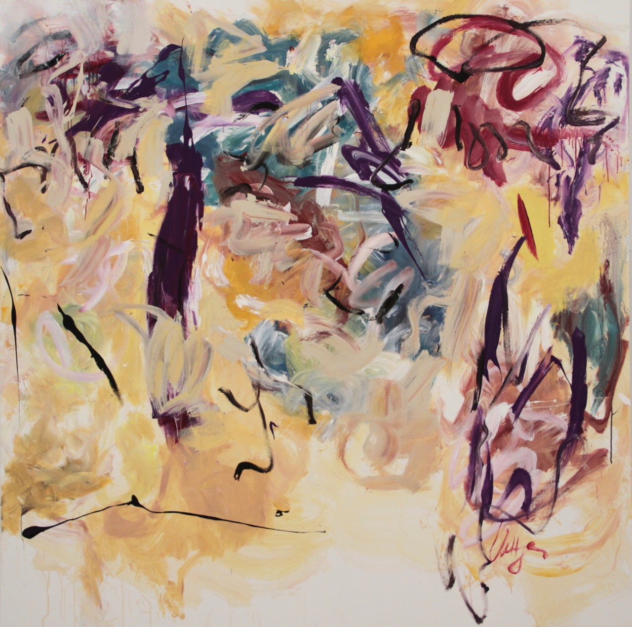 Mostly light colors. Darker TL through TC into C. Red/Brown swirl TR. Vertical black lines CL to TL and CR to BR. Verso. Stretcher is keyed. 1AC2014