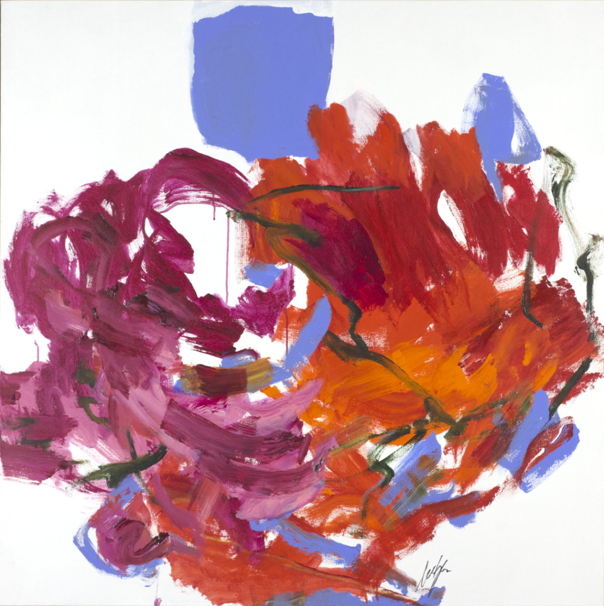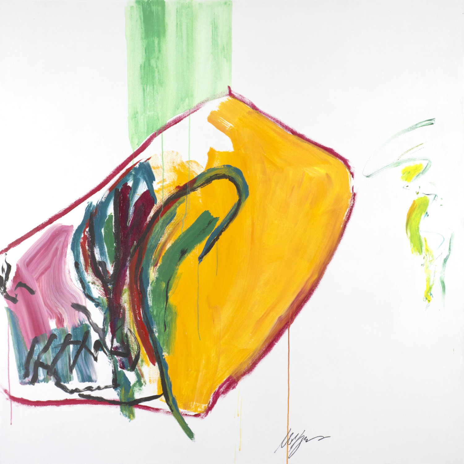 two orange ovals TC and BC. Burgundy in C. Green and black curls in from CL.