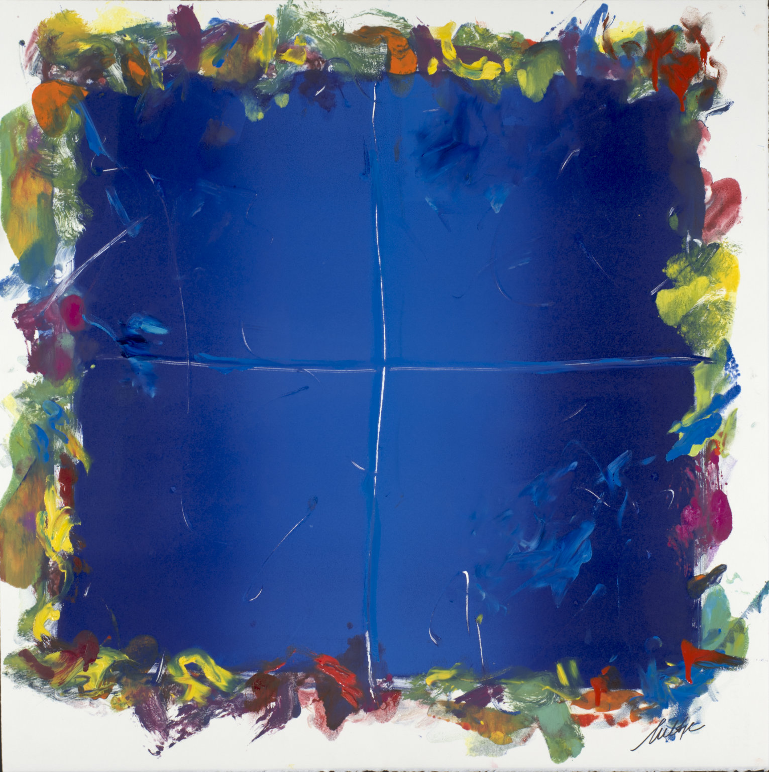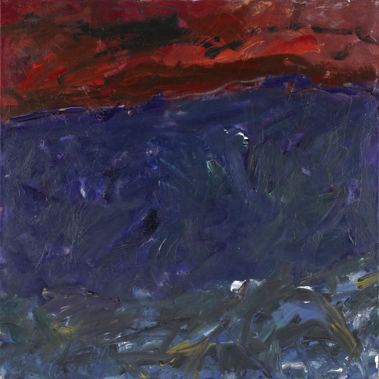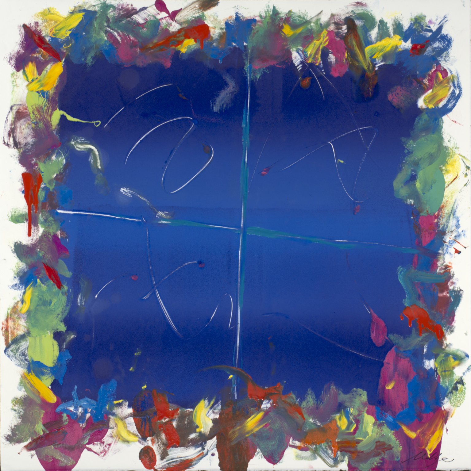Heavy red area BR behind signature. Deep, dark blue area TC & TR. Yellow TC to C. Several short parallel bars CL.