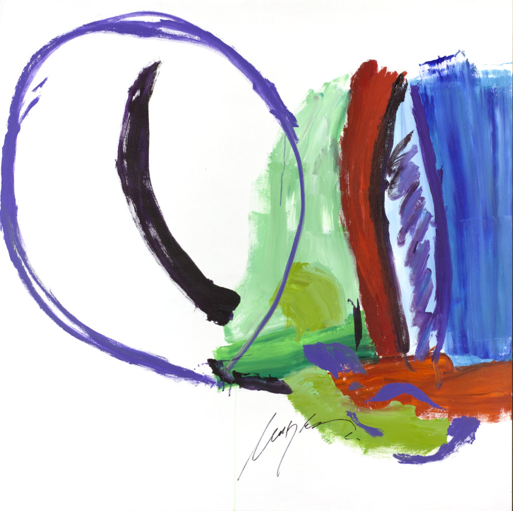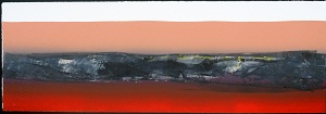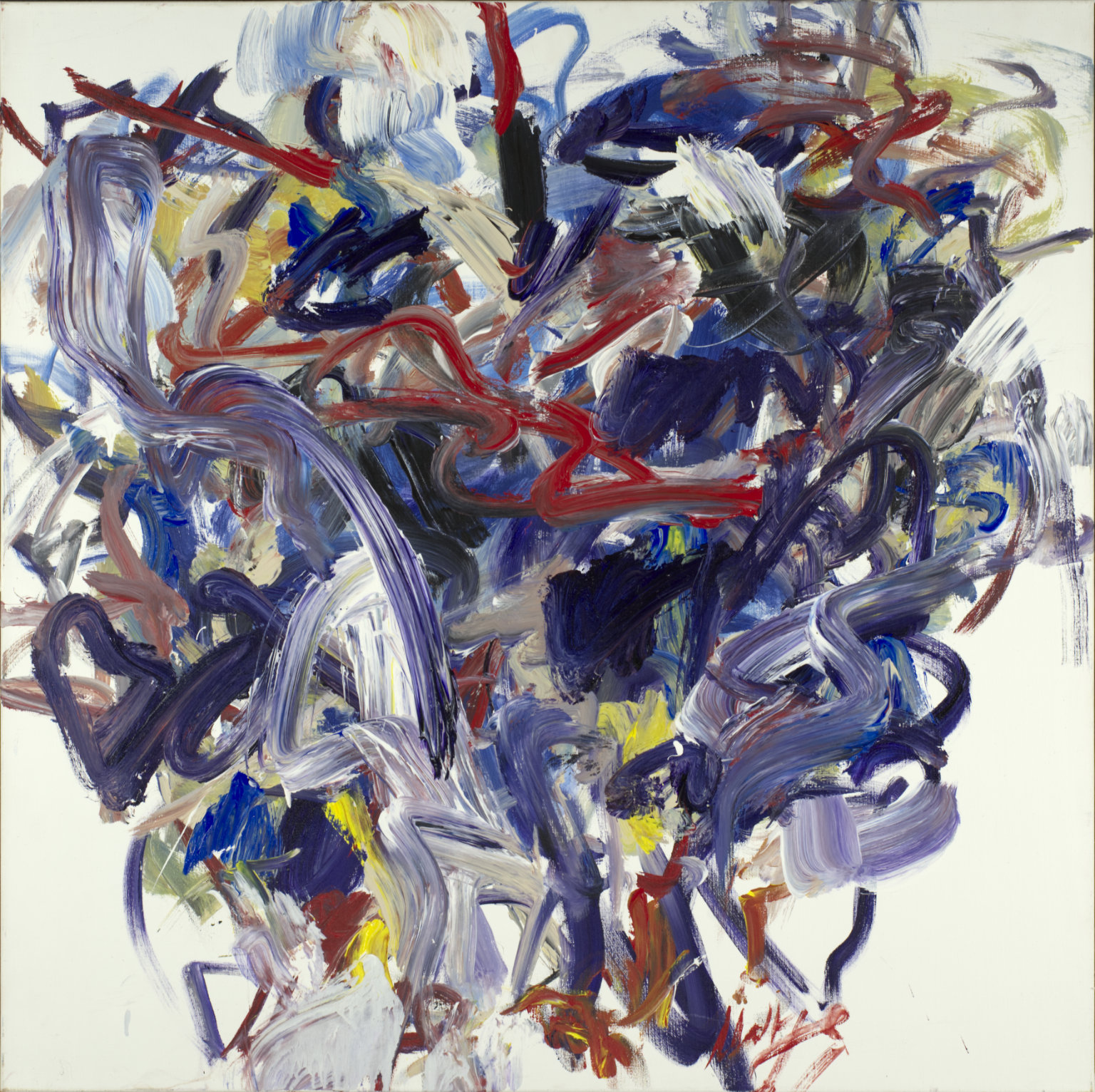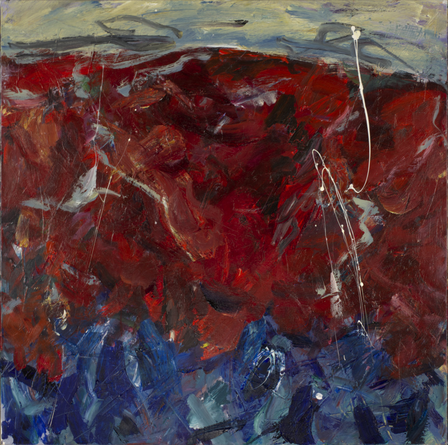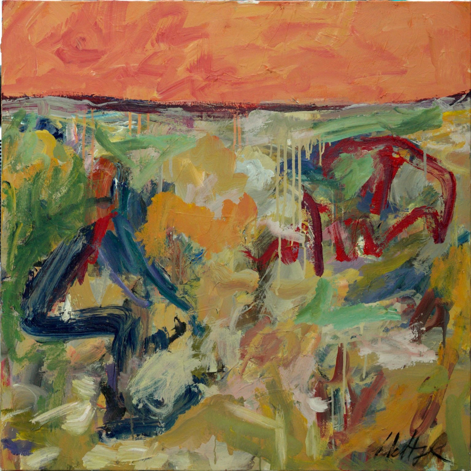 Heavy red area BR behind signature. Deep, dark blue area TC & TR. Yellow TC to C. Several short parallel bars CL.