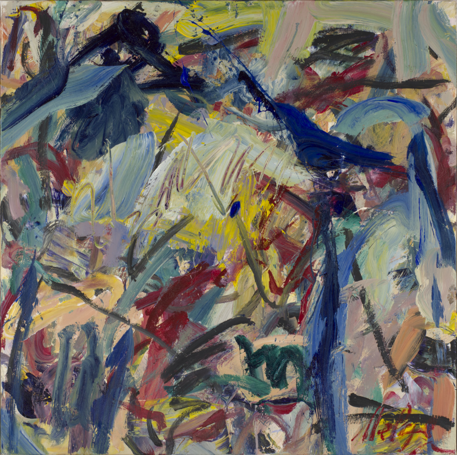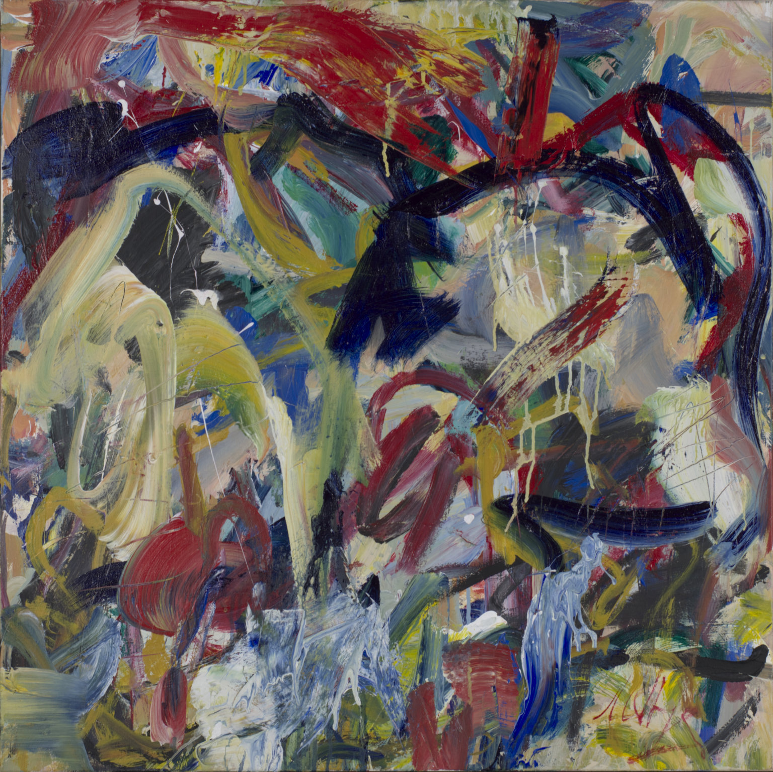 Acrylic painting. Mostly large areas of color in non-geometric shapes. BR quarter has upside down Y in red. TR parallel horizontal strokes in red.