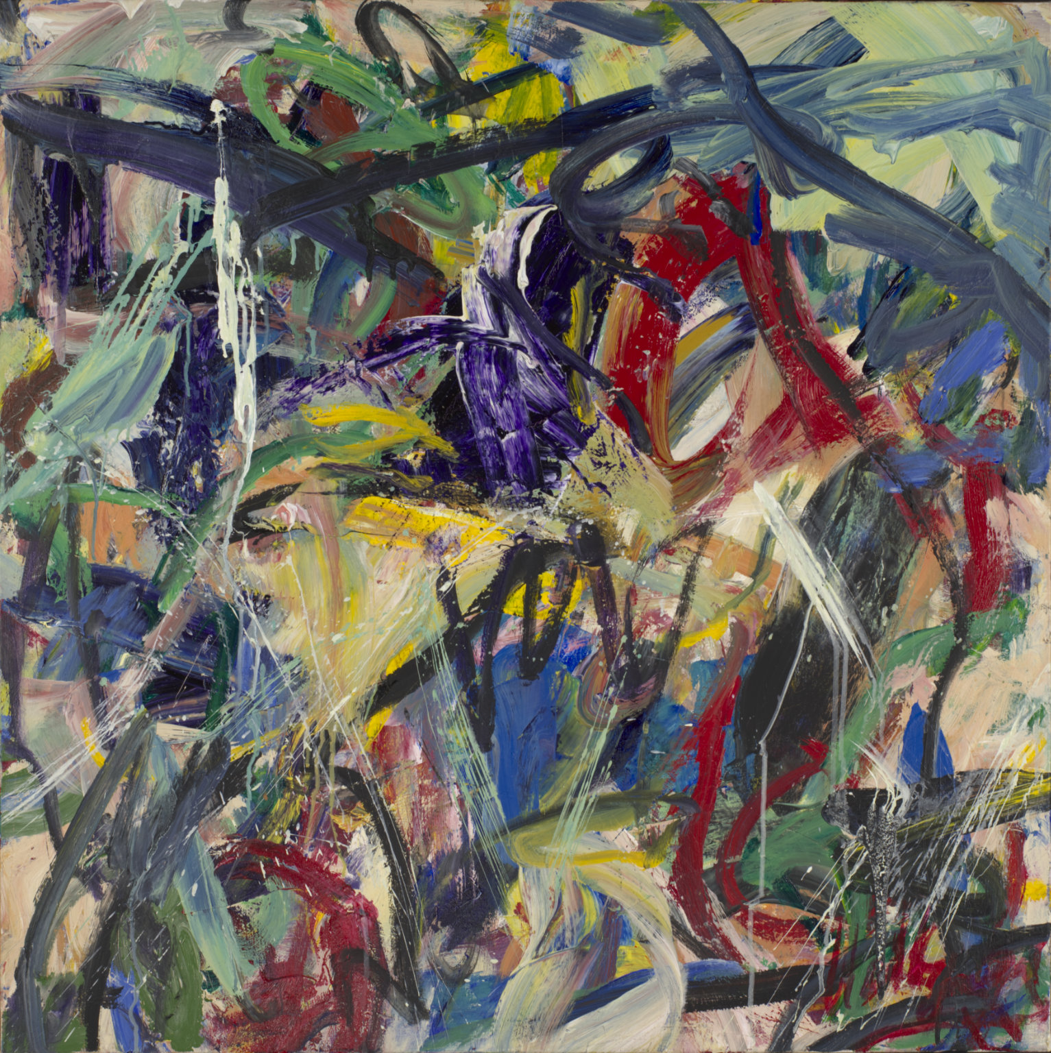 Multiple colors including reds, yellow, blues, greens, tans, black. Areas of dark blue in TR and BR. Yellow drips from TC. Light blue drips in CL. Green drips in TL. Verso. On TC edge of canvas: In the Darkness of Dawn 4/04. Crossed out on TC vertical stretcher bar: 30/98 36/99. Below: 6/2004. Sticker crossed out: NELTJE / If You Stopped Breathing / Acrylic on Canvas 1998 / 38" x 44". Below: 38. Stamped in C on both stretcher bars: TRI-MAR / ENTERPRISES INC. / HAND-MADE USA. Stretcher has screws, can be keyed.