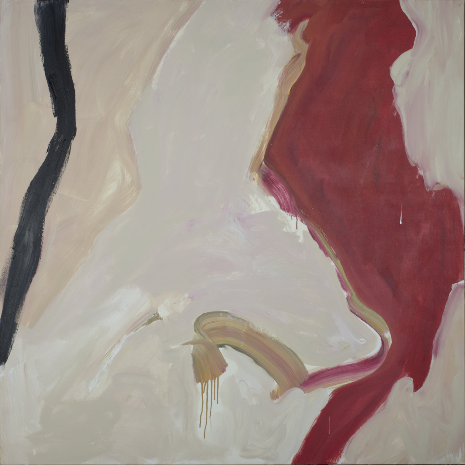 Acrylic painting. Large non-geometric shapes of solid colors. C into CL vertical area of yellow with two narrow drips extending up into gray area at the T. Black area BR. Several color areas dripping into white areas.