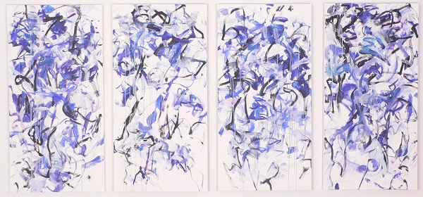 4 pieces. Blues, lavender, black with a lot of white space. Lighter colored drips throughout. 2 drips on L and one on R go from TL and TR to bottom edge. Verso. Signed on back TL: Neltje 3/05. Stamped on CL stretcher bar: <symbol> DEAD <symbol> STRAIGHT. Next in C: 33A/2005. Next on CR: BREEZE DANCE A.