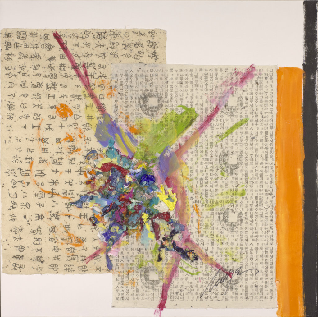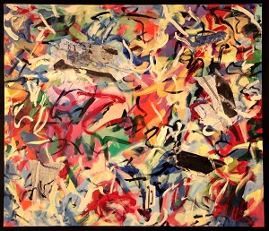 Mixed Media with paper and acrylic paint. Multi-colored, red "Z" shape left of C. Portions of foreign language newspapers in TL / TC, CR, and BL. BL section has English text in one article: Pre-School Teacher's Training. Printed material in BC has a picture of 2 decorative metal handles. Verso. Written in red on TC stretcher bar: 66 x 57. In black on TC stretcher bar: 25/AC/2006. In black on TC stretcher bar: Rhythm / Rock. In pencil on BC vertical stretcher bar: 52 3/4.