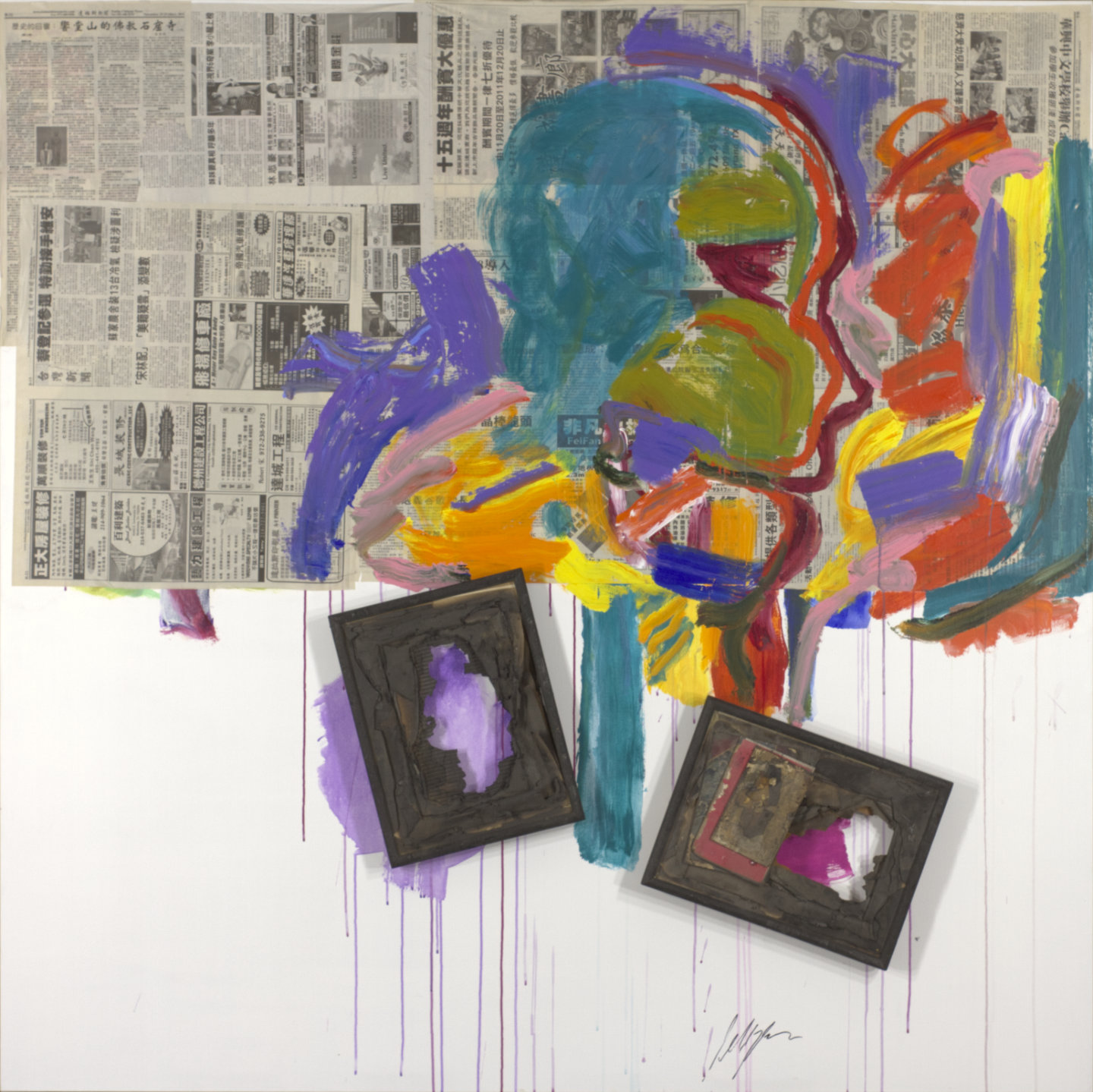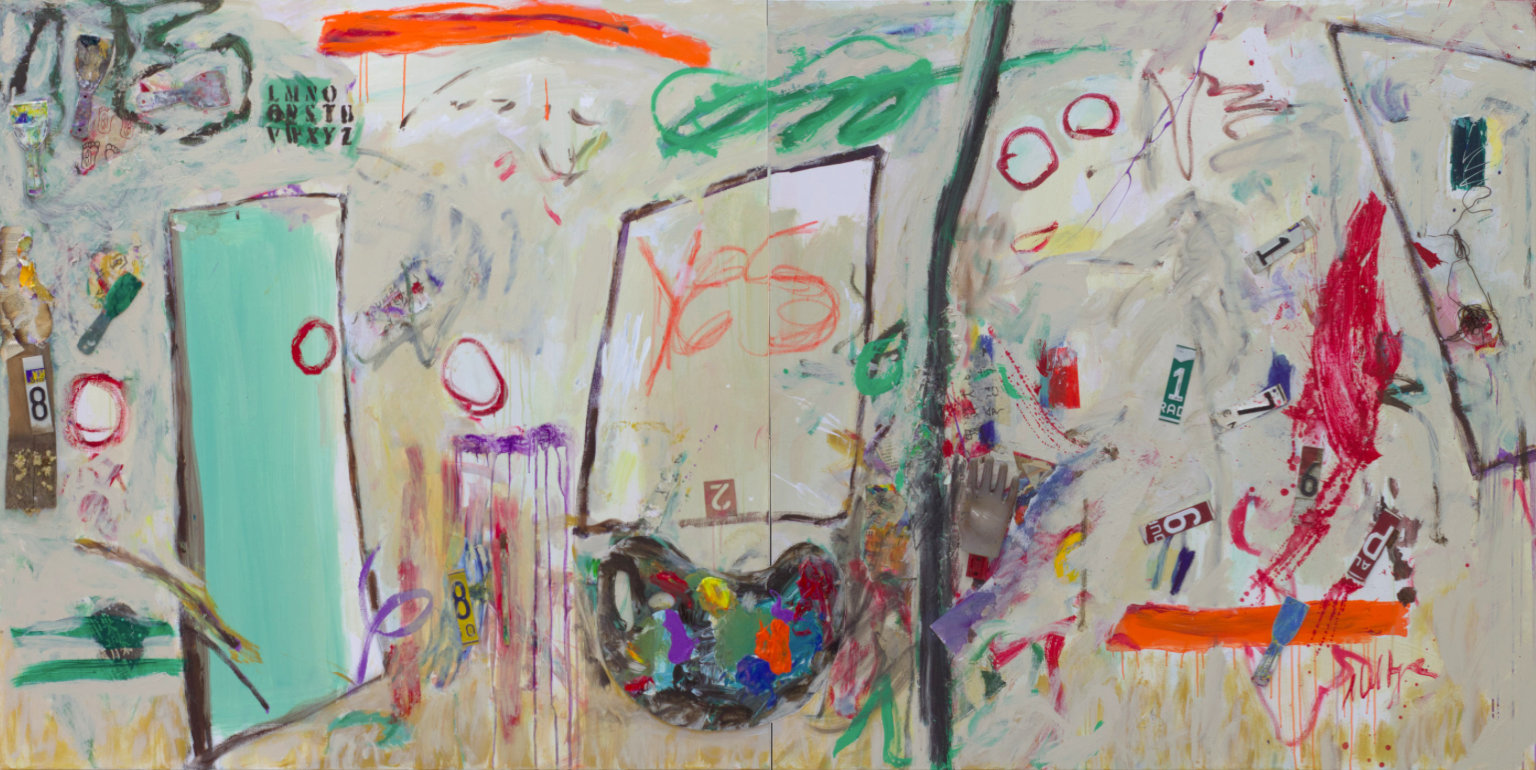 Diptych. Green door on L side, red doorknob. Orange horizontal line in TC / TR. Word YES in CR, spanning both pieces, with a purple box around word. Purple drips in BC. *Changed in 2011. Paint added, but essentially the same. *Changed again in 2011. Paint scrapers added to TL and CL. Burned pages from a book in CL. Paint palette in BR, spans both pieces. Verso. TC vertical stretcher bar: 11 AC / Diptych / A / 2010 / Open / Your / Window. CL stretcher bar: 55 3/4.