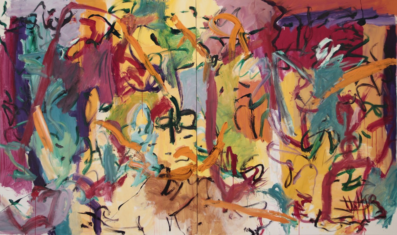 Left panel of Diptych (72"x120"). Vertical Red and Magenta adjacent to Vertical Blue TL/CL. Larger areas of lighter colors (Greens, Tans, Beige) near BR. Several Orange swoops. Verso. 5A/AC2014
