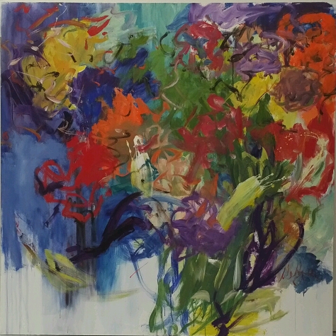 Acrylic painting. Many medium areas of colors mostly reds, blues, oranges and greys. Red area TR. Orange area in C. TL blue with red strokes atop. Squiggles extending out from almost central point in BC almost like a plant.