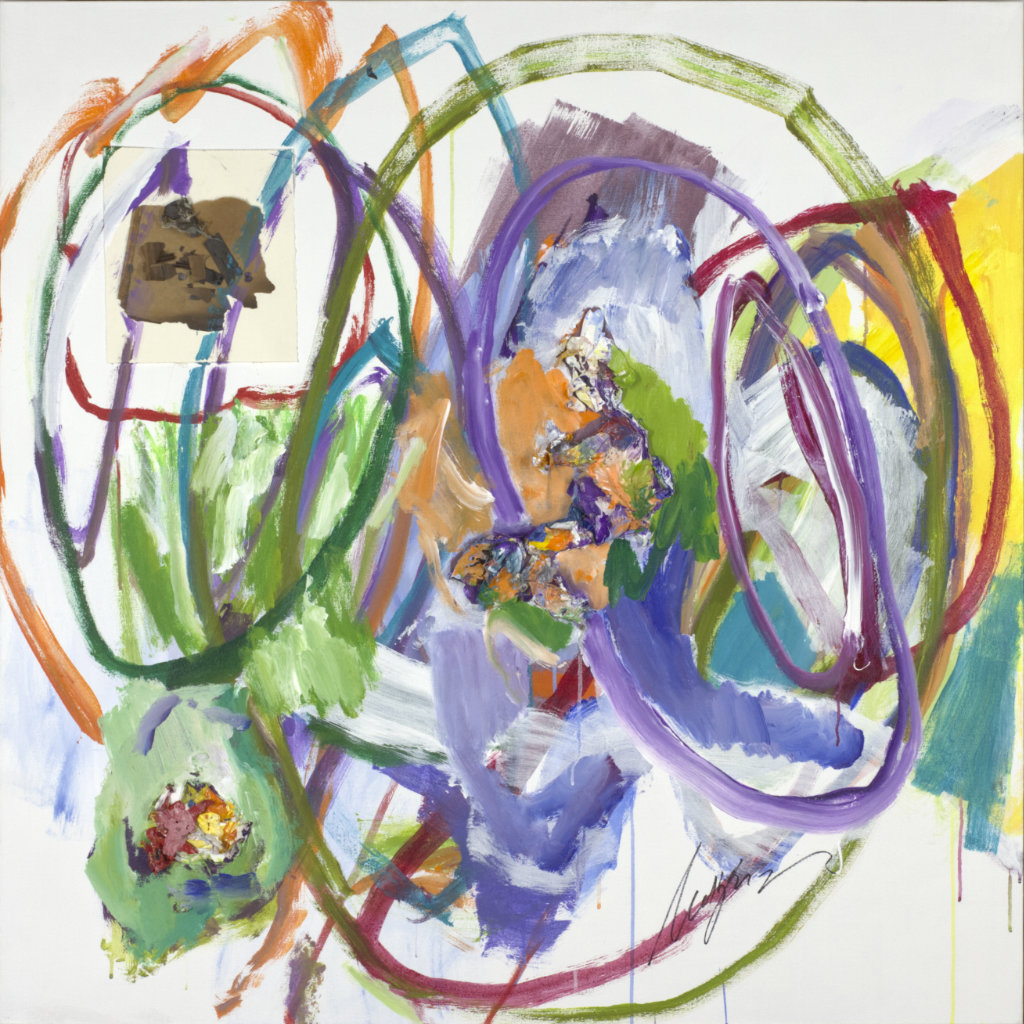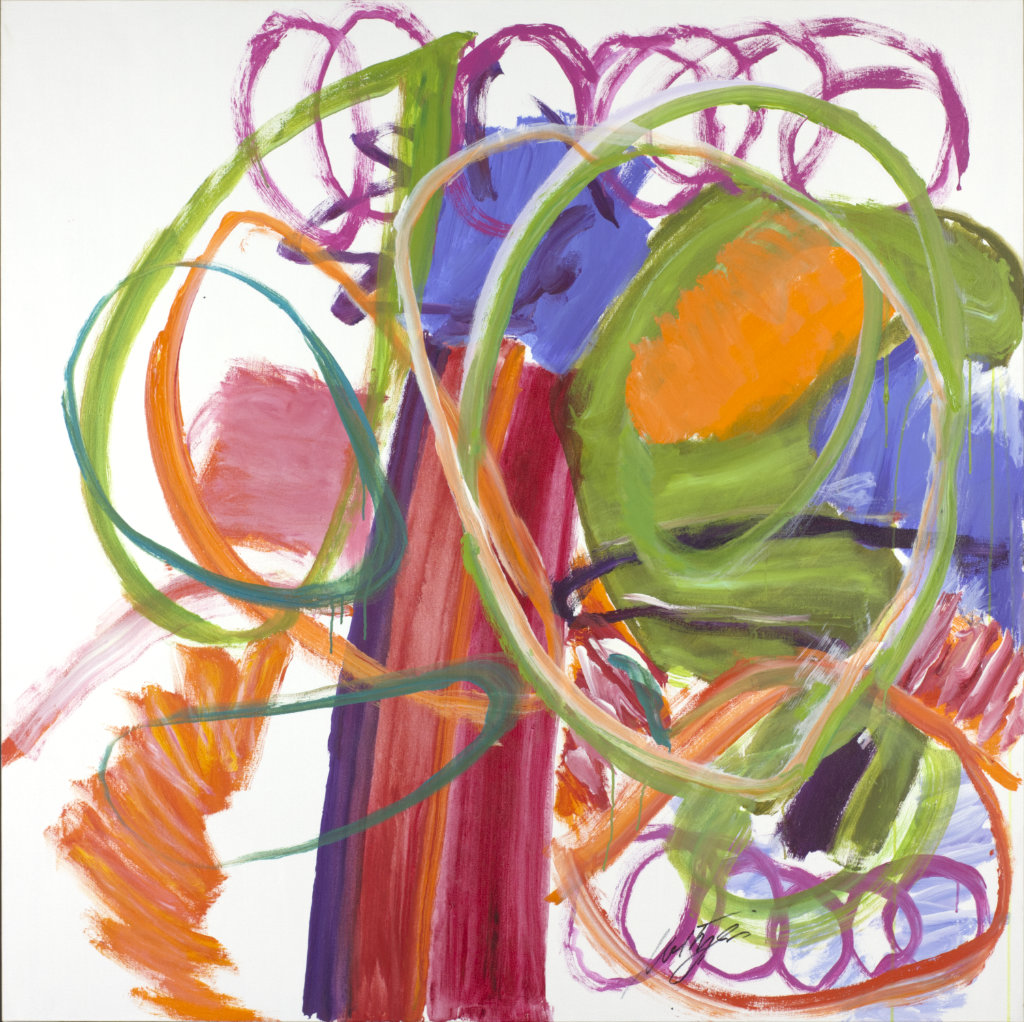Colors include purples, reds, blues, yellows, greens, black. White space in corners, especially BL and BR. In TC is a vertical red line with a vertical black line below. Verso. On TC vertical stretcher bar: 18/2005 I'm Done / Being / Perfect Feb '05. Sticker below: NELTJE Top / I'm Done Being Perfect / Acrylic On Canvas 2005 / 36" x 36" 18/AC/2005. Stamped below: <symbol> DEAD <symbol> STRAIGHT. On BC vertical stretcher bar: 31 3/4.