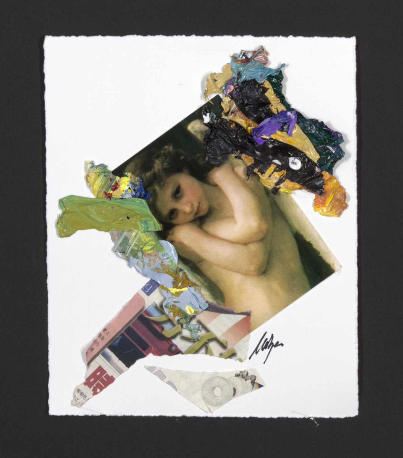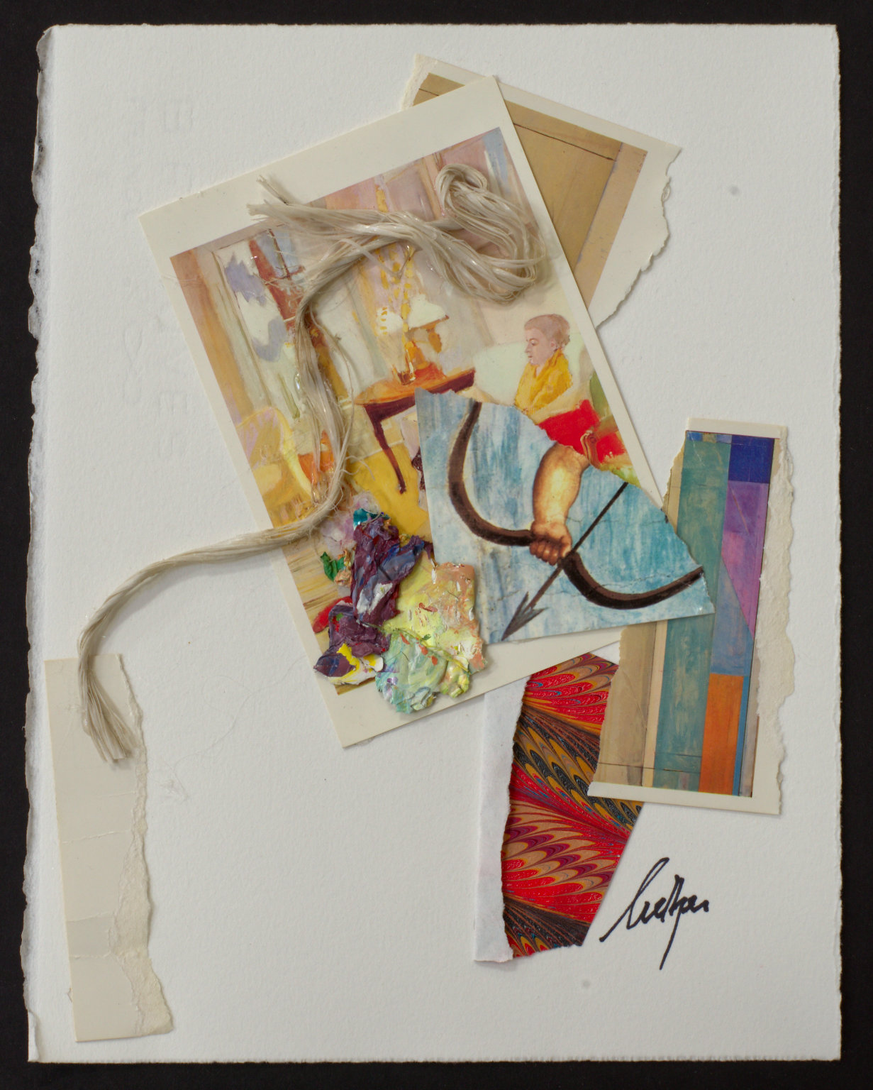 Collage on deckle edged paper. Postcard in C extending to TL portraying painting of woman sitting and youngster on floor. Twine curled at T of postcard and curving along image covering youngster face and on to CL where end meets strip of white paper that continues along to BL corner. Some other torn pieces of paper include Cupid arm and bow and arrow, bars of color, waving or woven pattern in red.