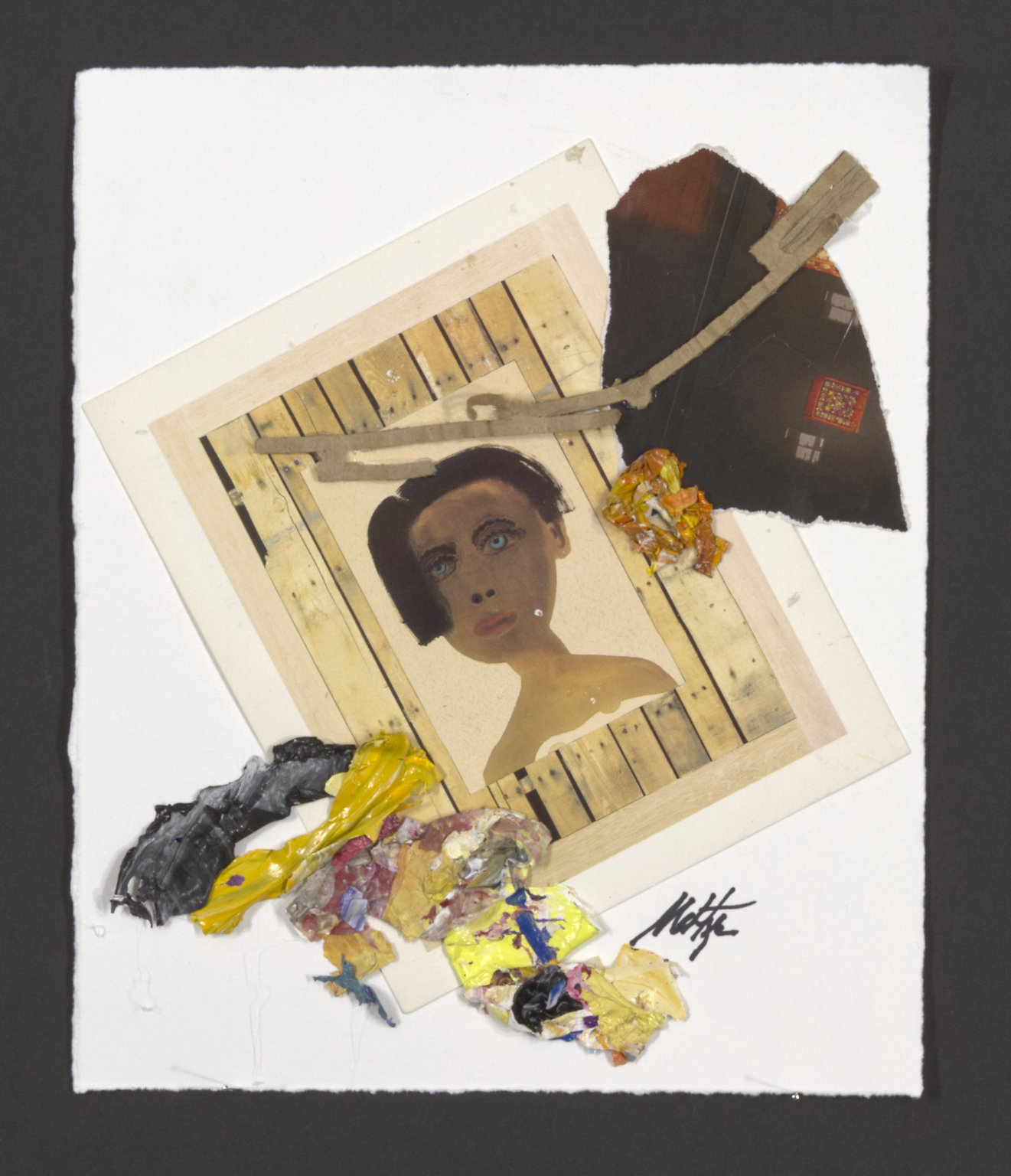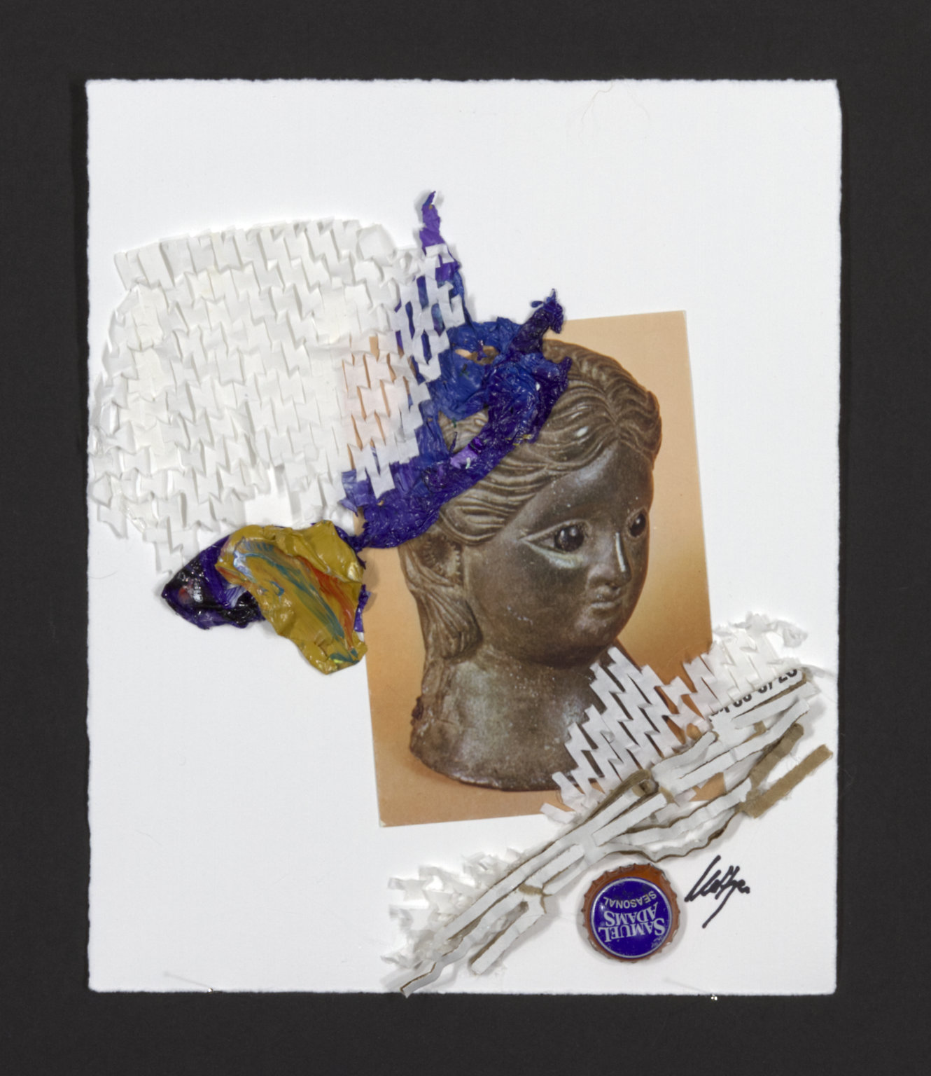Collage on deckle edged paper. Postcard portraying sculpture of bust. Bottle cap BR from Samuel Adams bottle. Dried acrylic paint CL. Torn pieces of packing mesh, white, TL and BR. Strands of cardboard strips angling across BR.