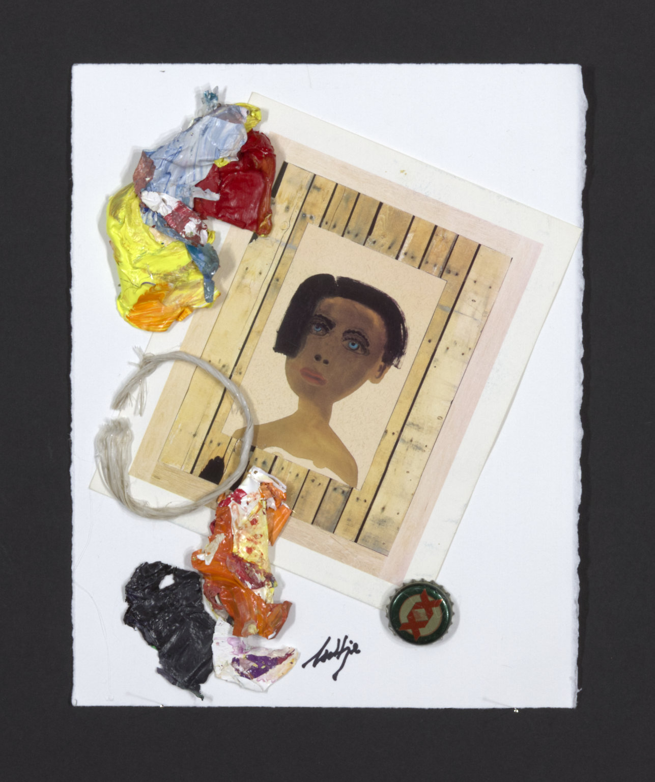 Collage on deckle edged paper. Postcard in C portraying photo of painting on planks. Painting of individual with black hair hanging down right side of face. Dried acrylic paint TL and BL. Twine in nearly complete circle CL. Bottle cap BR.