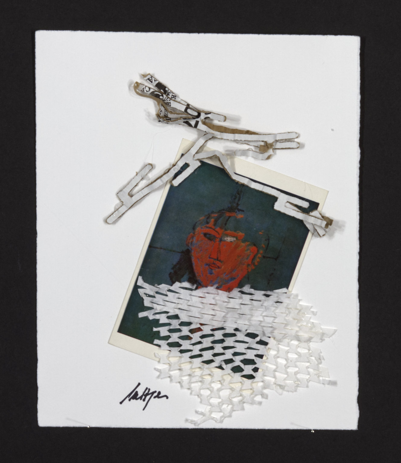 Collage on deckle edged paper. Postcard in C portraying painting of red-faced individual on dark background. Cardboard strips along T of postcard and white packing mesh covering B of postcard.