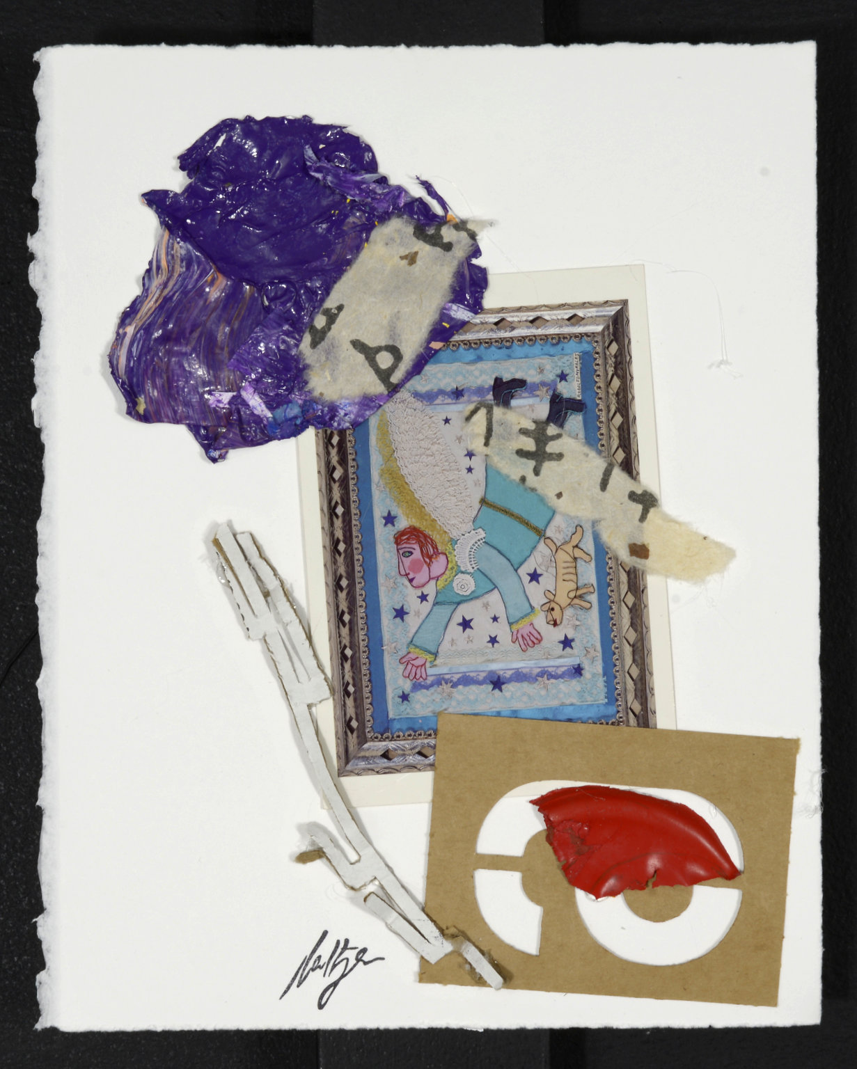 Collage on white paper. Postcard on L. Asian newsprint TR. Dried acrylic paint BL of postcard. Green paper above signature in BR.