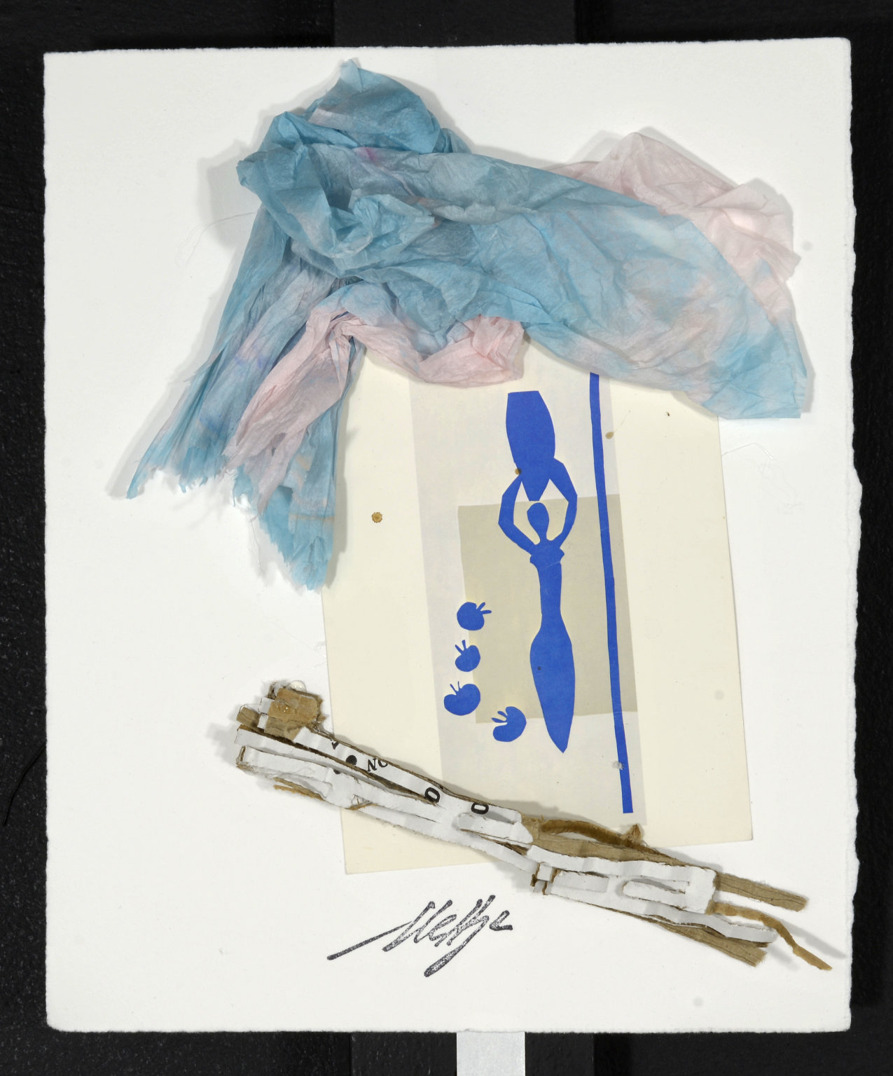 Collage on deckle edged paper. Tissue paper across top. Postcard in C depicting Matisse's Woman with Amphora and Pomegranetes. Cardboard across bottom.