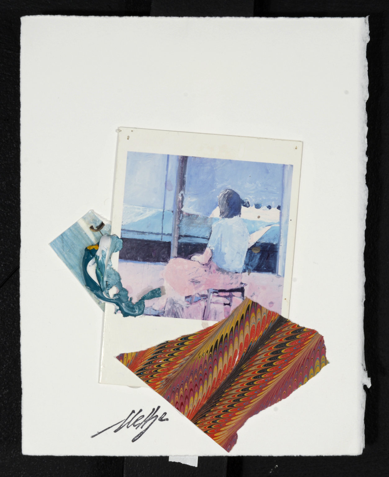 Collage on deckle edged paper. Postcard in C portraying painting of woman or girl sitting on white chair reading a book. Twine curves around BL corner of postcard. Various pieces of dried acrylic paint border the postcard TC, BL and BR.