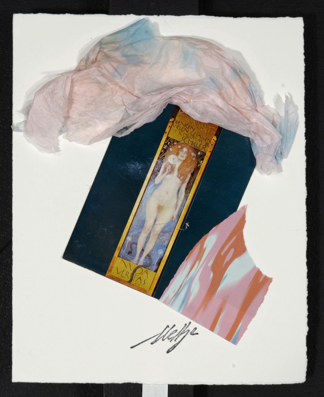 Collage on paper. Tissue paper arching across T. In C, postcard depicting Nuda Veritas (Gustav Klimt, 1899). Torn paper with marbelized inking BR. Stamped signature BC.