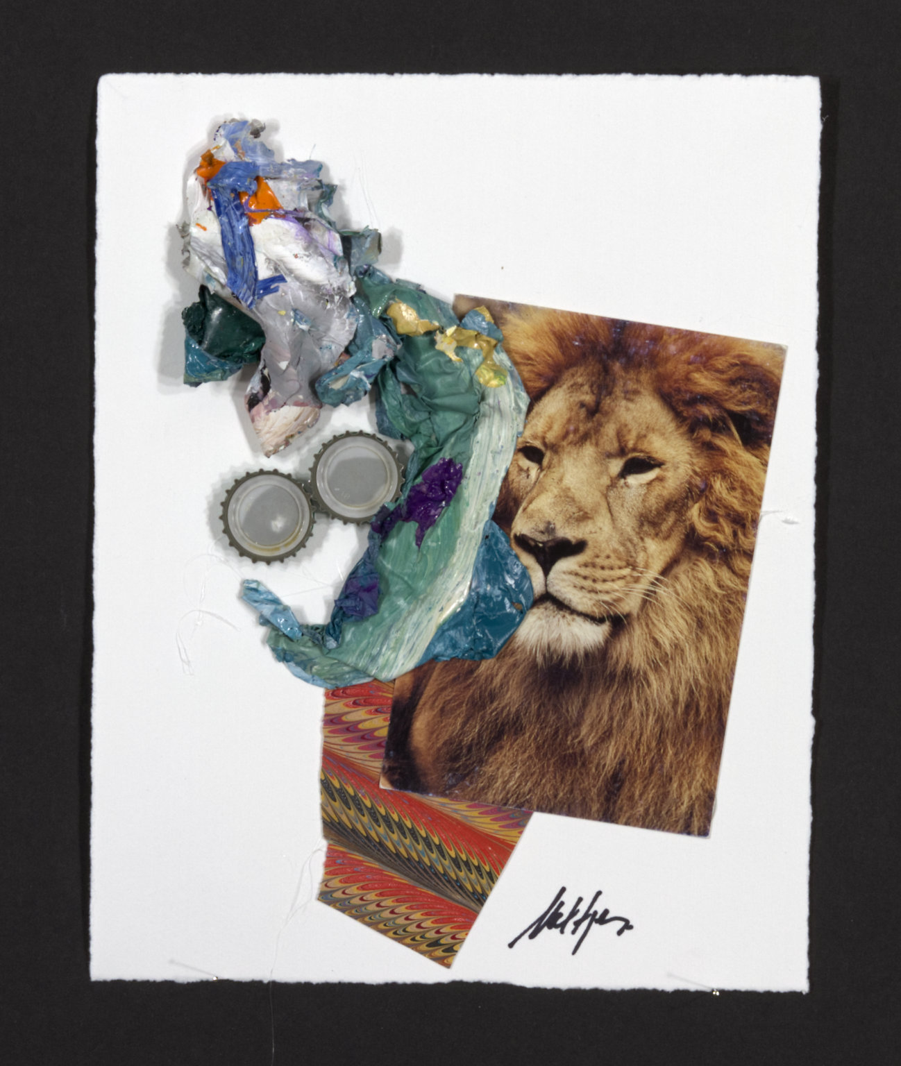Collage on paper. Image of lion CR and C. Two bottle caps CL. Bunch of dried acrylic paint extending out into a curve from TL through C to CL around the bottle caps. Torn paper with marbelized print from C to BC. Signature BC.