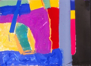 Greenes, yellows, reds with some blue, light yellow. BL CL TL white smears with large white paint splatter. TC dark blue drip gray drips to C. C yellow paint platter going toward teh right. RT light yellow paint splatter. BC white canvas showing. BL blue paint. Verso: Center stretcher bar written in blue pen C/2012