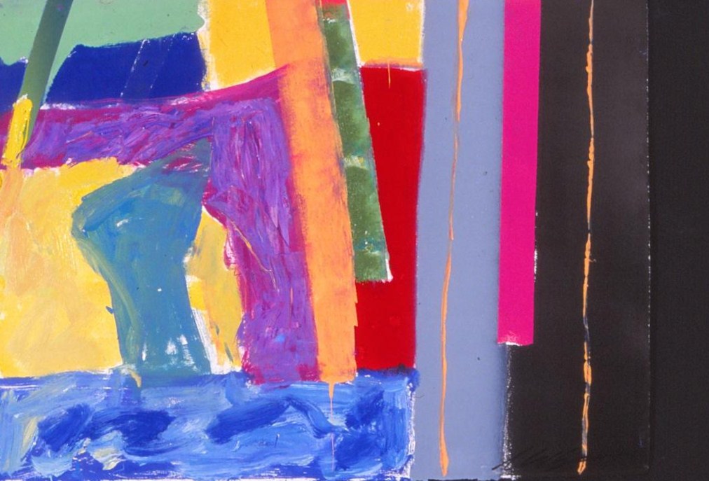 Deckle edge paper. Wide gray and black vertical lines on R with blue, yellow, and pink line in between. Blue in BL / BC on edge. Verso, backing board. TL label, upside down: Neltje Top / Quality of Flaws IV / Monotype 2002 / 22" x 30" 18m02. Gold sticker TC: TOUCAN / CONTEMPORARY ART CUSTOM FRAMING / 2505 Montana Avenue <dot> Billings, Montana 59101.