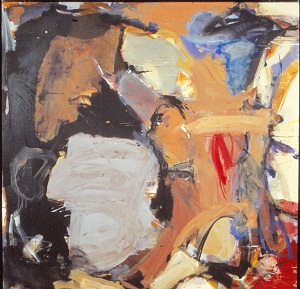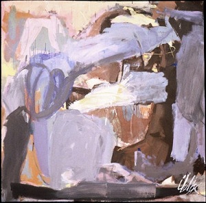 Large areas of color: black, browns, blues, reds. Large blue area in bottom quarter. Drips are sideways, L to R. White space on TR/CR. A lot of black on L side. Verso. TR canvas: Our Dust and Bones Will Mingle / 1987. CR stretcher bar, label: STREMMEL GALLERY / 1400 SOUTH VIRGINIA STREET / RENO, NEVADA 89502 / TELEPHONE (702)786-0558 / FAX (702)786-0311 / Artist: Neltje / Title: Our Dust and Bones Will Mingle / Size: 72" x 72" Medium: Acrylic / canvas / No.: 10413 Neg. No.: $4,000. Stretcher has screws and can be keyed.