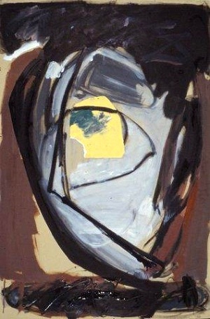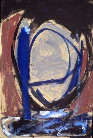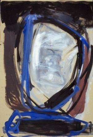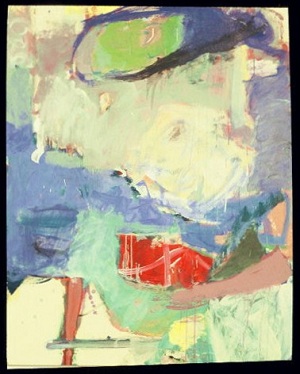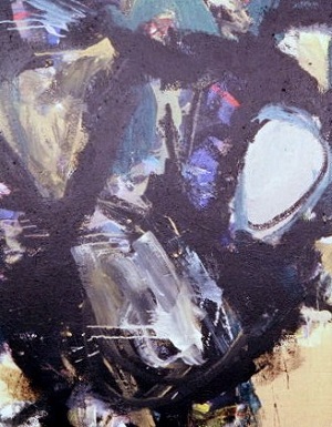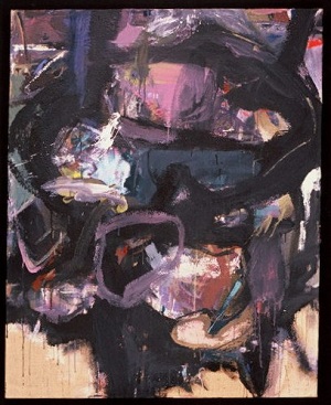 Painting on jute. Dark painting, primarily black with greens, grays, blues, red. Black drips in BR. Drips from R to L on L side. Short red lines in TL and TC. Blue gray area in CR. Verso. Sticker on TC vertical stretcher bar: NELTJE / Do You Smell The Roses? / Acrylic 1987 / 60" x 48" 2. Stamped on C vertical stretcher bar: FINE ART MATERIALS, INC. / 336-346 LAFAYETTE STREET / NEW YORK, NEW YORK 10012 / (212)982-7100. C stretcher bar: 45 48. BC vertical stretcher bar: NELTJE / 11 LOWER PINEY CREEK RD. / BANNER, WY 82832. Stretcher can be keyed.