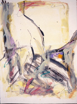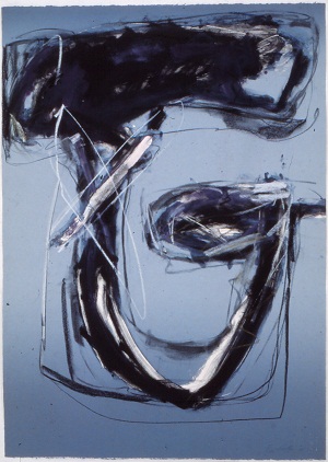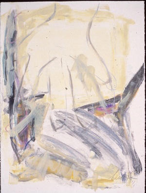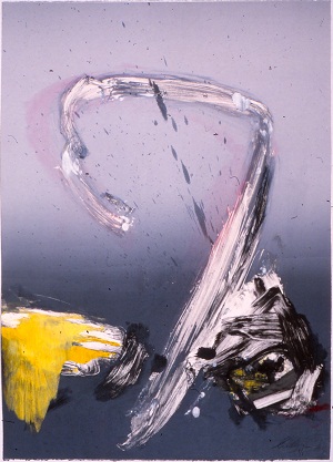 Deckle edge paper. Gray background, darker at T and B. Lines and dark areas almost like like a "G". Short, white and purple diagonal line in TC to CL. BR: 1/1 Neltje 88. Verso. TR: 12 11/88. BR: 12/88. Watermark BL: ARCHES / FRANCE <symbol>. Diamond stamp in BL. 2 pieces of tape at T.