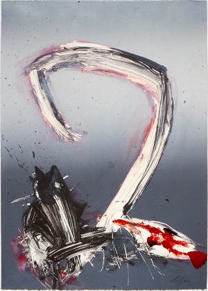 Deckle edge paper. Background is gray, lighter at top. Dark gray spatters in TL / CL. Red and black "7" shape dominates. Red across B. Black area in BL. BR: Neltje / 1/1. Verso. TL: Hand in a Gray Field V / 5/87. TR: 5. Watermark BL: ARCHES / FRANCE <symbol>. BL stamp in a diamond shape.
