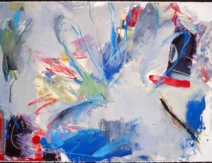 Colors are primarily blues with greens, reds, yellow. White space in BL. Red and pink area in BC with blue dripping towards top. Lavender area in BR with drips. TC has a blue area with green inside. Verso. Sticker on C stretcher bar: NELTJE / Gone Ghost / Acrylic 1987 / 48" x 60" 9. Stamped upside down: 48. Stamp under sticker from a business in Paramus, NY. Stretcher can be keyed.