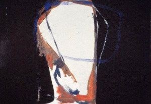 Deckle edge paper. Black background. White vertical area through C. Reddish areas around edge of white. Blue rectangle in TC / C. BC: 1/1 Neltje 88. Verso, backing. TL, 2 labels from: CYDNEY PAYTON GALLERY / 2544 FIFTEENTH DENVER CO 80211 303 458 6006. L label: $650 / unframed / Neltje / Monotype #2 / 1898 <sic> / $650 unframed / 31" H x 45" W. R lable: NELTJE / <crossed out> "Untitled", monotype / 31" x 47" (framed), 1988 / $850.00 / Spectator II. TR label: Spectator II / Monotype 1988 / 30" x 41" 6m1988.