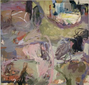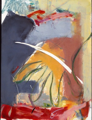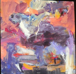 Drips at T run up, others run down. Pale colors, purples, blues, greens. Some white space across T and in BL. Pinkish-orange in BC. Lavender spatter in BL. C is blue-green and lavender. Verso. TC stretcher bar, sticker: NELTJE / Dawn Ramble / Acrylic 1988 / 6' x 6'. Stamped on both CL stretcher bars: 72. Stretcher has screws and can be keyed.