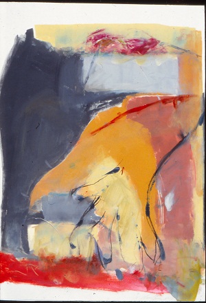 Deckle edge paper. "Hand" shape in C / CR / BC. Yellow rectangular shape in TC. Red curved line in TR / CR. BR: 1/1 Neltje 88. Verso. TL: 43=488. Below, sideways: L. TR: L=43 / 11/88. BL has a diamond shaped stamp.