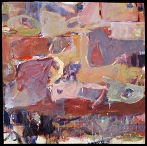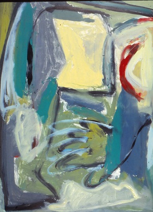 Pale colors, a lot of drips, especially at bottom. Wide, horizontal, reddish line in BC / BR. Two rectangle shapes in TR. A little white space across B. Verso. TC stretcher bar, sticker: NELTJE / I Must Swim In / Reasonable Waters / Acrylic 1989 / 6' x 6'. Stretcher has screws and can be keyed.