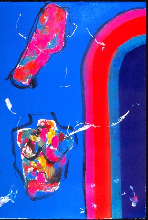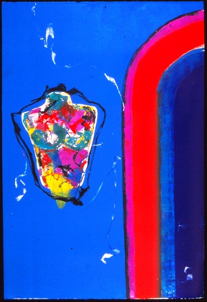 Deckle edge paper. Stripes on R side curve off edge in TR, colors are black, teal, red, purple, and blue. 2 torsos on L, top one is pink and orange, bottom one is multi-colored. White lines throughout. Verso. All 4 corners: 43/00. TC: There Is My Room V. TR: There is my / room V. Watermark TR and BL: BFK RIVES / FRANCE <symbol>.
