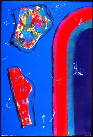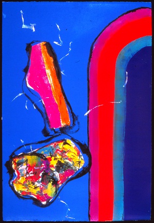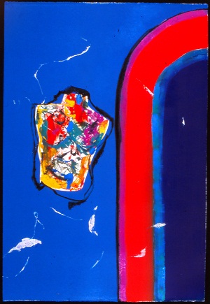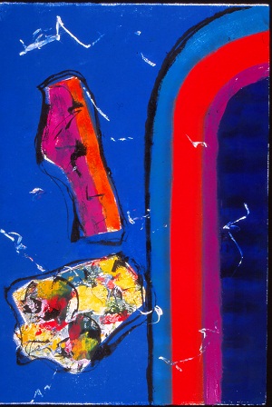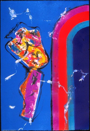 Deckle edge paper. Stripes on R side curve off edge in TR, colors are black, purple, red, teal, and blue. Multi-colored torso on L. 2 white spots below, white lines throughout. Verso. All 4 corners: 40/00. TC: There Is My Room II. Watermark TR and BL: BFK RIVES / FRANCE <symbol>.