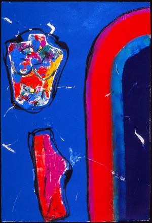 Deckle edge paper. Stripes on R side curve off edge in TR, colors are black, purple, red, teal, and blue. 2 torsos on L, top one is multi-colored, bottom one is red and purple. White lines throughout. Verso. All 4 corners: 41/00. TC: There Is My Room III. Watermark TR and BL: BFK RIVES / FRANCE <symbol>.