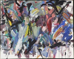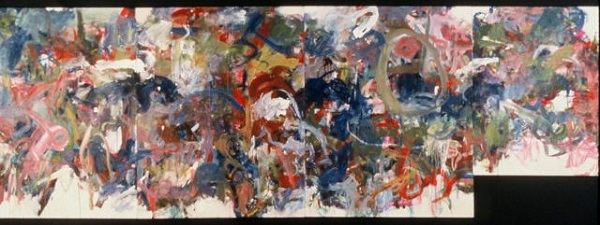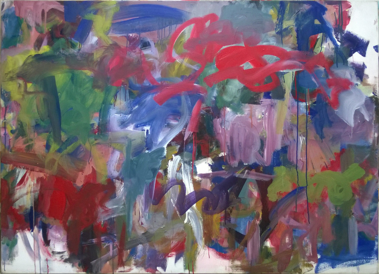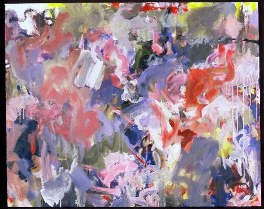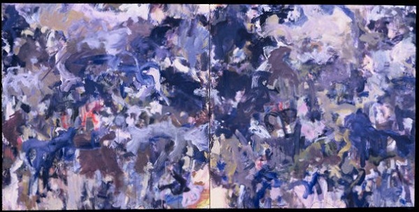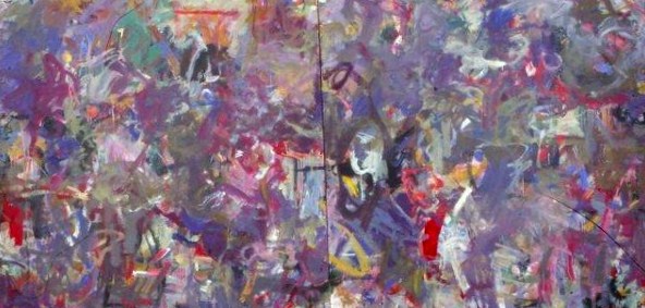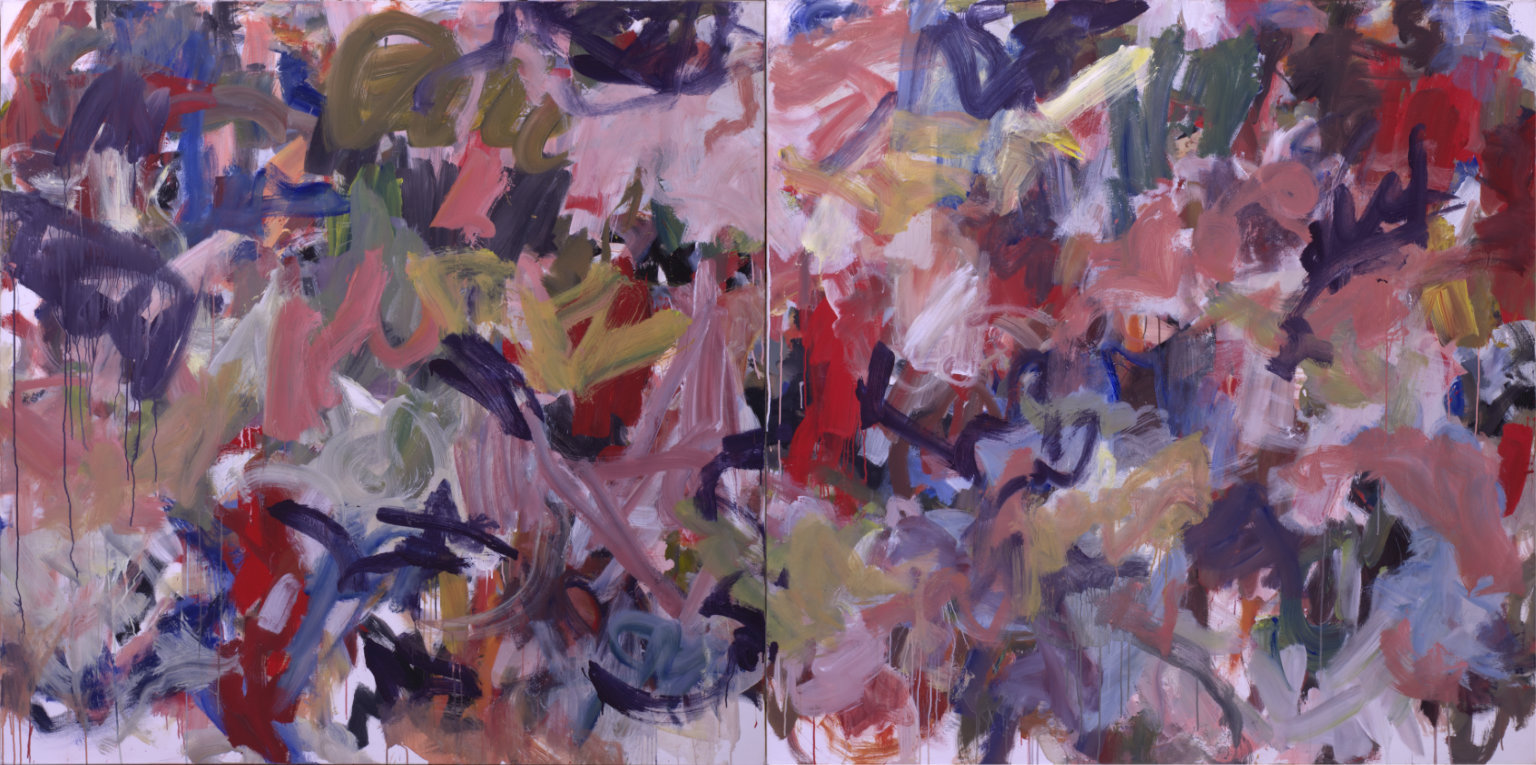 Diptych. Colors are pinks, blues, greens, red. Numerous blue drips on L. Pink in C. Olive green in TC. Small areas of white space at bottom. Light pink in TR. Verso. TC vertical stretcher bar: Top. Below: Summer / Wish / 1992. Stretcher has screws and can be keyed.