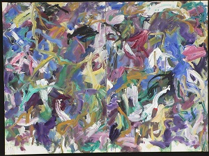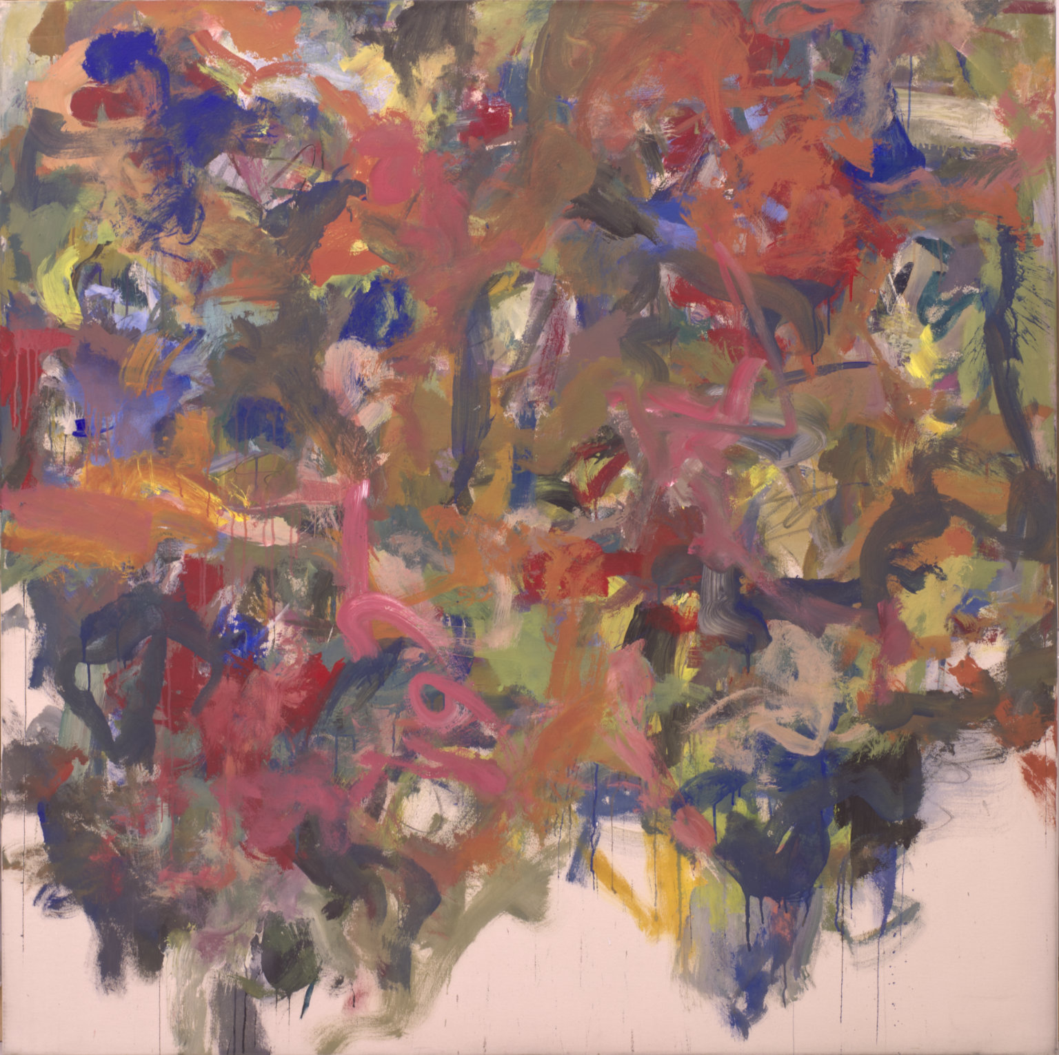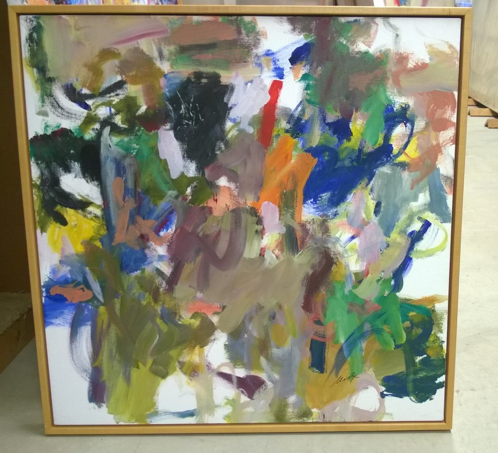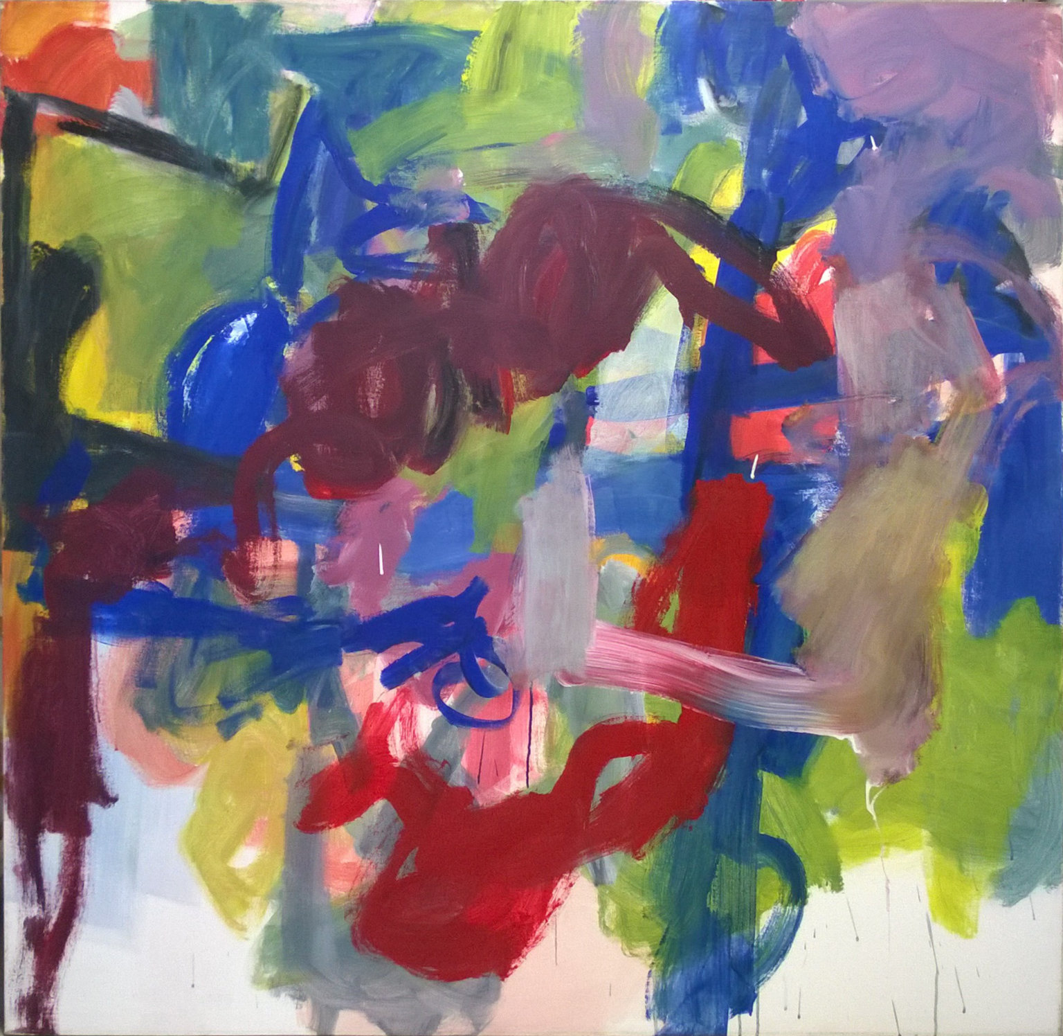 Multiple, dense colors with white space across bottom. Colors include pinks, greens, blues, yellow, and red. Dripping paint. BR corner is white space with blue paint dripping down. On back. On both T vertical stretcher bars: 7AC/1990 Summer/Passing. Stapled upside down on BC stretcher bar: YELLOWSTONE / ART CENTER / 401 NORTH 27TH STREET, BILLINGS, MT 59101-1290 / NELTJE, SUMMER PASSING, 1990 / acrylic on canvas / 72 x 72 inches. Stretcher has screws and can be keyed.