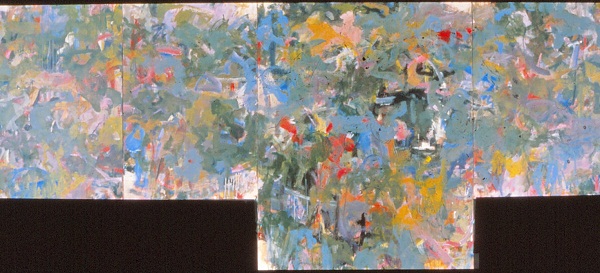 4 pieces. Primarily blues and greens with some pinks and yellows. Drips from C move to top, light purple. Verso. TL canvas edge: Inside. TC canvas edge: A. TR canvas edge: Outside. Sticker on CR stretcher bar: NELTJE / Looking Straight / Up / Acrylic 1990 / 11' 7" x 5'. Stretcher has screws and can be keyed.